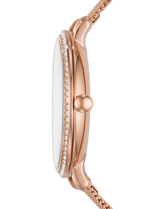 Женские наручные часы с кристаллами Fossil FB-01 ES4628, кварцевый механизм с высокой точностью. Класс водозащиты: 30 метров, позволит защитить корпус от случайных брызг или капель дождя. Корпус часов изготовлен из стали, золотистого цвета.
