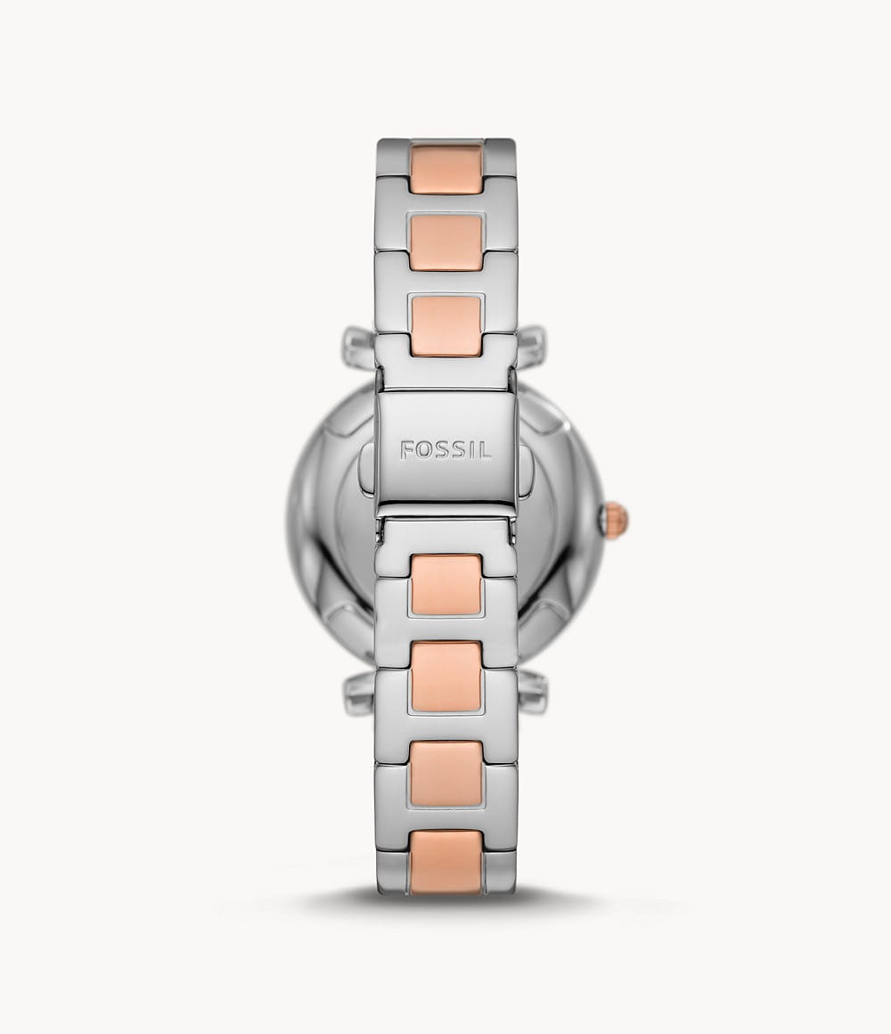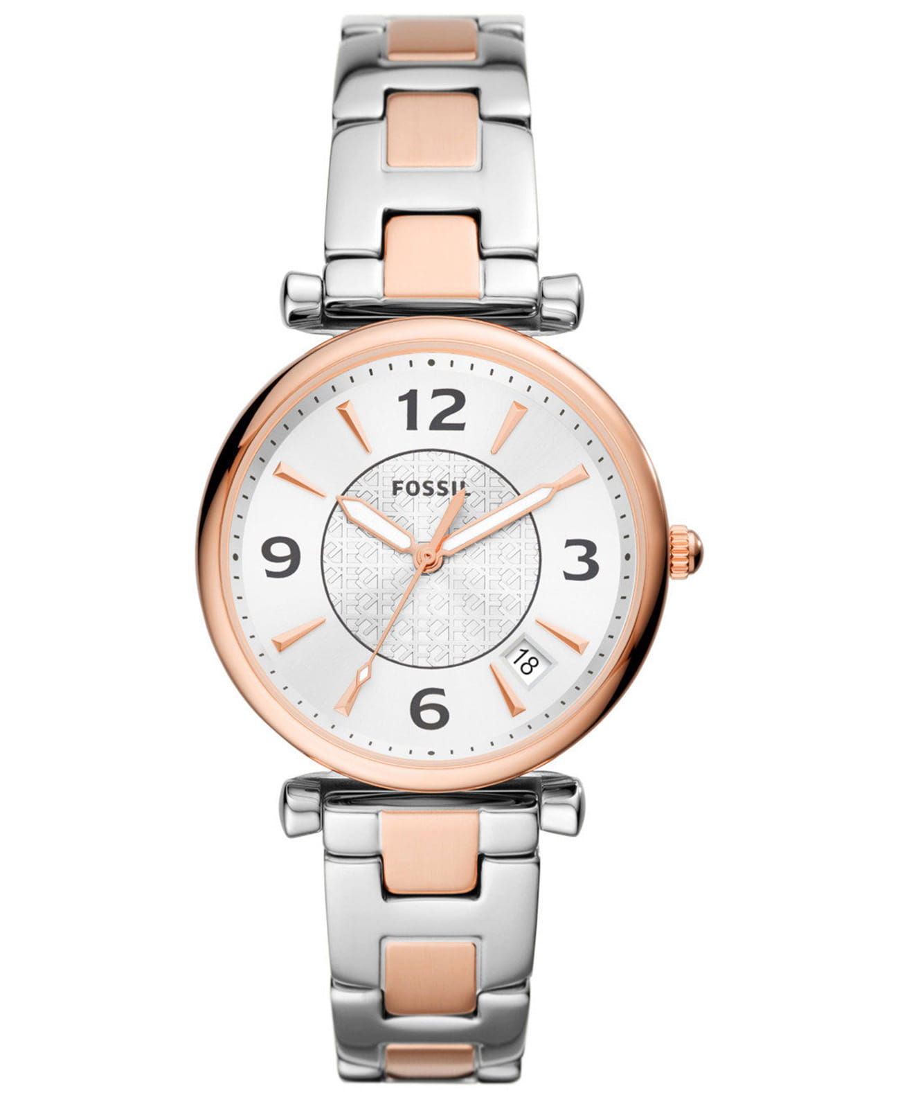 Женские американские часы Fossil Carlie ES5156, кварцевый механизм с высокой точностью. Класс водозащиты: 50 метров, позволит защитить корпус от случайных брызг или капель дождя. Круглый стальной корпус c полированной поверхностью изготовлен из стали с частичным розовым IP-покрытиемIP-покрытиеМетод ионного напыления. Демонстрирует повышенную устойчивость к истиранию, окислению и химическим веществам. Под воздействием высокого давления и температуры около 1500°C молекулы металла надёжно соединяются с частицами корпуса часов.. Центральная часть циферблата украшена декоративным узором. Метки в виде арабских цифр и штрихов с люминесцентной подсветкойЛюминесцентное покрытиеПозволяет считывать показания времени в темноте. Производители наносят на стрелки, часовые индексы, безель или поверхность циферблата светонакопительный состав, дающий холодное свечение.. Окошко даты находится между часовыми отметками 4 и 5. Рифленая заводная головка. Полированный стальной браслет с частичным розовым IP-покрытиемIP-покрытиеМетод ионного напыления. Демонстрирует повышенную устойчивость к истиранию, окислению и химическим веществам. Под воздействием высокого давления и температуры около 1500°C молекулы металла надёжно соединяются с частицами корпуса часов. имеет раскладывающуюся застежкуРаскладная застёжкаТакой тип застёжки используется только на браслетах из металла. Она никогда не раскрывается полностью, происходит разделение на 2 и более частей. Раскладывающая застёжка снизит вероятность потери часов к минимуму..
