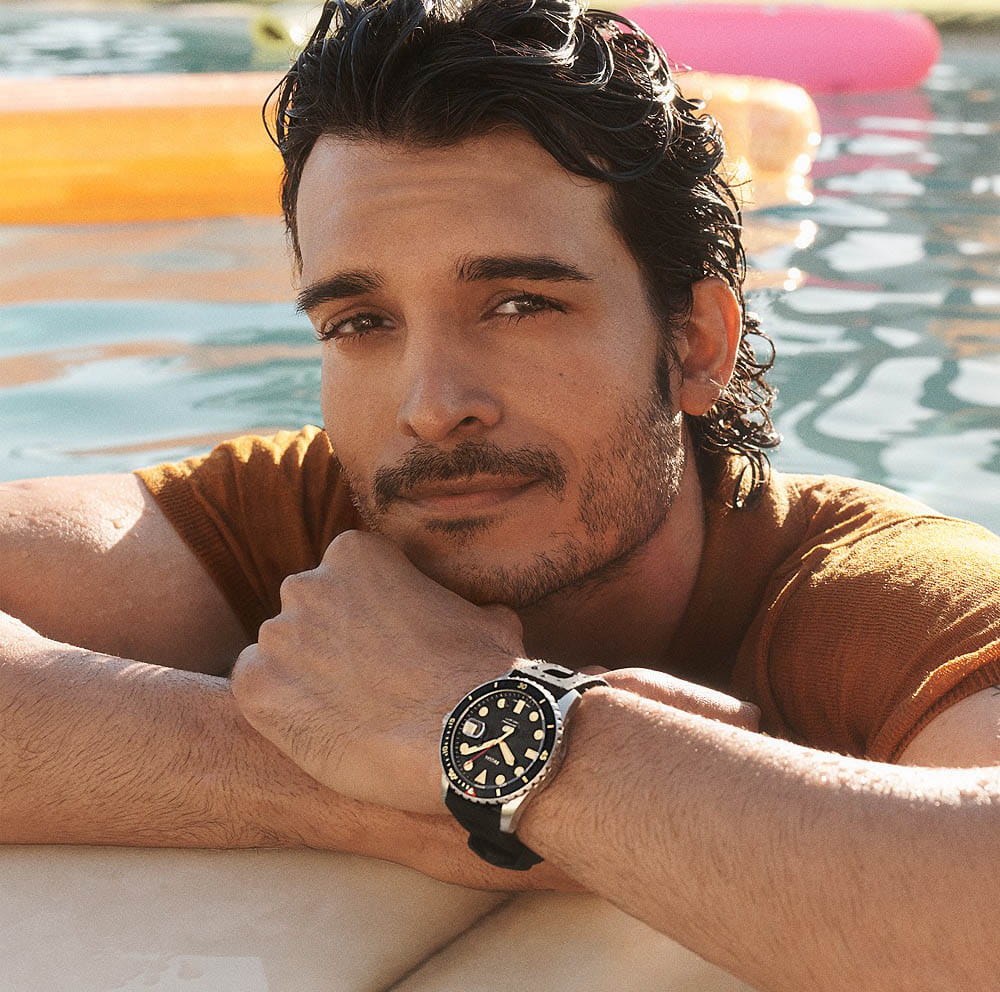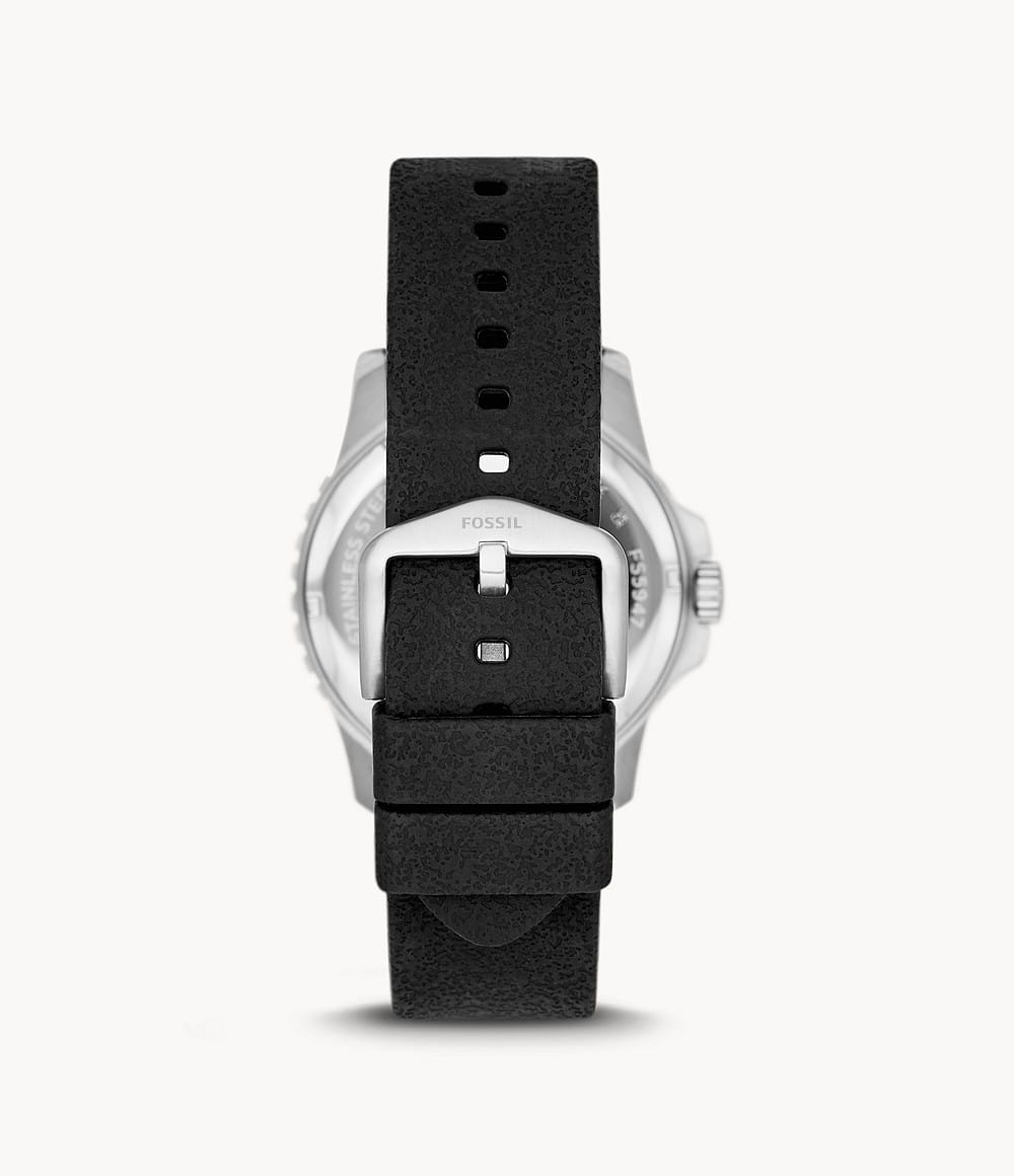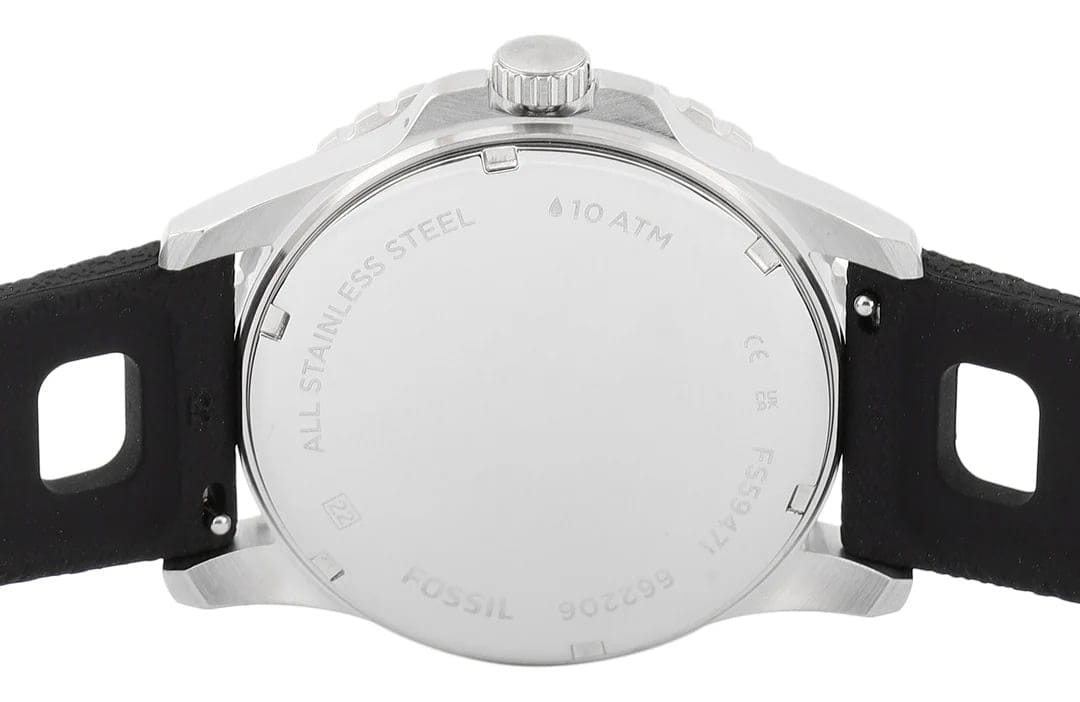Мужские наручные часы с минеральным стекломМинеральное стеклоМинеральное стекло представляет собой искусственно выращенный минерал кварца. Такое стекло отличается особой устойчивостью к повреждениям и царапинам. Уступает по некоторым качествам сапфировому стеклу. Fossil Blue FS5947, кварцевый механизм с высокой точностью. Класс водозащиты: 100 метров, позволит плавать, нырять и заниматься другими водными видами спорта. Корпус часов изготовлен из стали. Метки в виде точек на циферблате и окошко даты находится в положении 3 часа. Силиконовый ремешок на стандартной застёжке. БезельБезельВнешний ободок, закрепляющий стекло. В спортивных часах так называется поворотное кольцо с делениями на циферблате, выполняет роль таймера – замеряет отрезки времени на шкале. Неподвижный безель – элемент декора. Однонаправленно вращающийся безель на дайверских часах позволяет фиксировать моменты погружения и выныривания на поверхность. с IP-покрытиемIP-покрытиеМетод ионного напыления. Демонстрирует повышенную устойчивость к истиранию, окислению и химическим веществам. Под воздействием высокого давления и температуры около 1500°C молекулы металла надёжно соединяются с частицами корпуса часов.. Стрелки и метки с люминесцентным покрытиемЛюминесцентное покрытиеПозволяет считывать показания времени в темноте. Производители наносят на стрелки, часовые индексы, безель или поверхность циферблата светонакопительный состав, дающий холодное свечение..