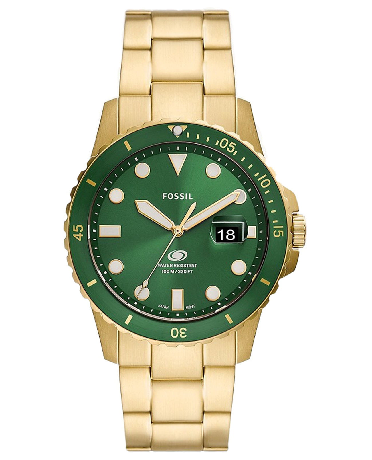 Мужские наручные часы на стальном браслете Fossil Blue FS5950, кварцевый механизм с высокой точностью. Класс водозащиты: 100 метров, позволит плавать, нырять и заниматься другими водными видами спорта. Корпус часов изготовлен из стали с IP-покрытиемIP-покрытиеМетод ионного напыления. Демонстрирует повышенную устойчивость к истиранию, окислению и химическим веществам. Под воздействием высокого давления и температуры около 1500°C молекулы металла надёжно соединяются с частицами корпуса часов. зеленого цвета. Метки в виде точек на циферблате и окошко даты находится в положении 3 часа. Ремешок из стали с IP-покрытиемIP-покрытиеМетод ионного напыления. Демонстрирует повышенную устойчивость к истиранию, окислению и химическим веществам. Под воздействием высокого давления и температуры около 1500°C молекулы металла надёжно соединяются с частицами корпуса часов. золотого цвета на раскладывающейся застёжкеРаскладная застёжкаТакой тип застёжки используется только на браслетах из металла. Она никогда не раскрывается полностью, происходит разделение на 2 и более частей. Раскладывающая застёжка снизит вероятность потери часов к минимуму..