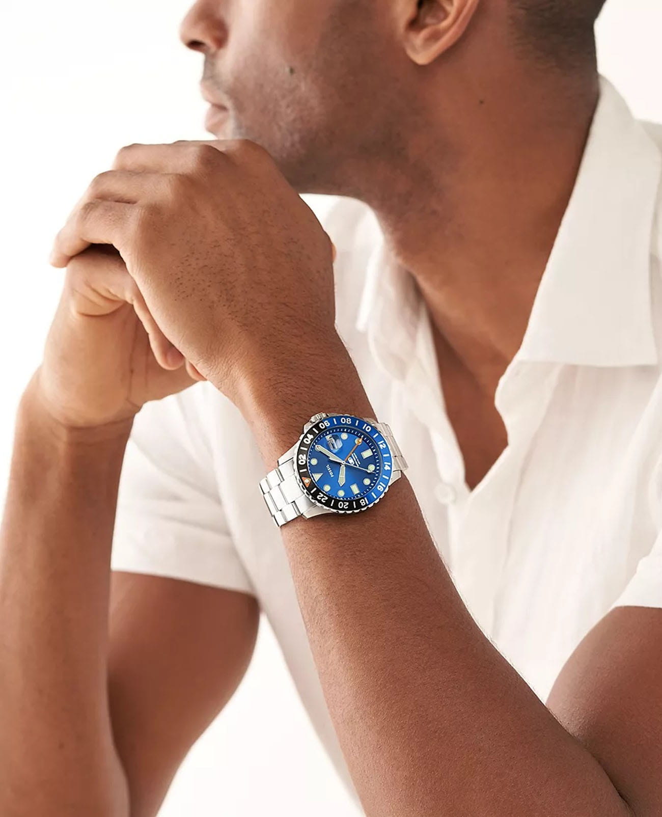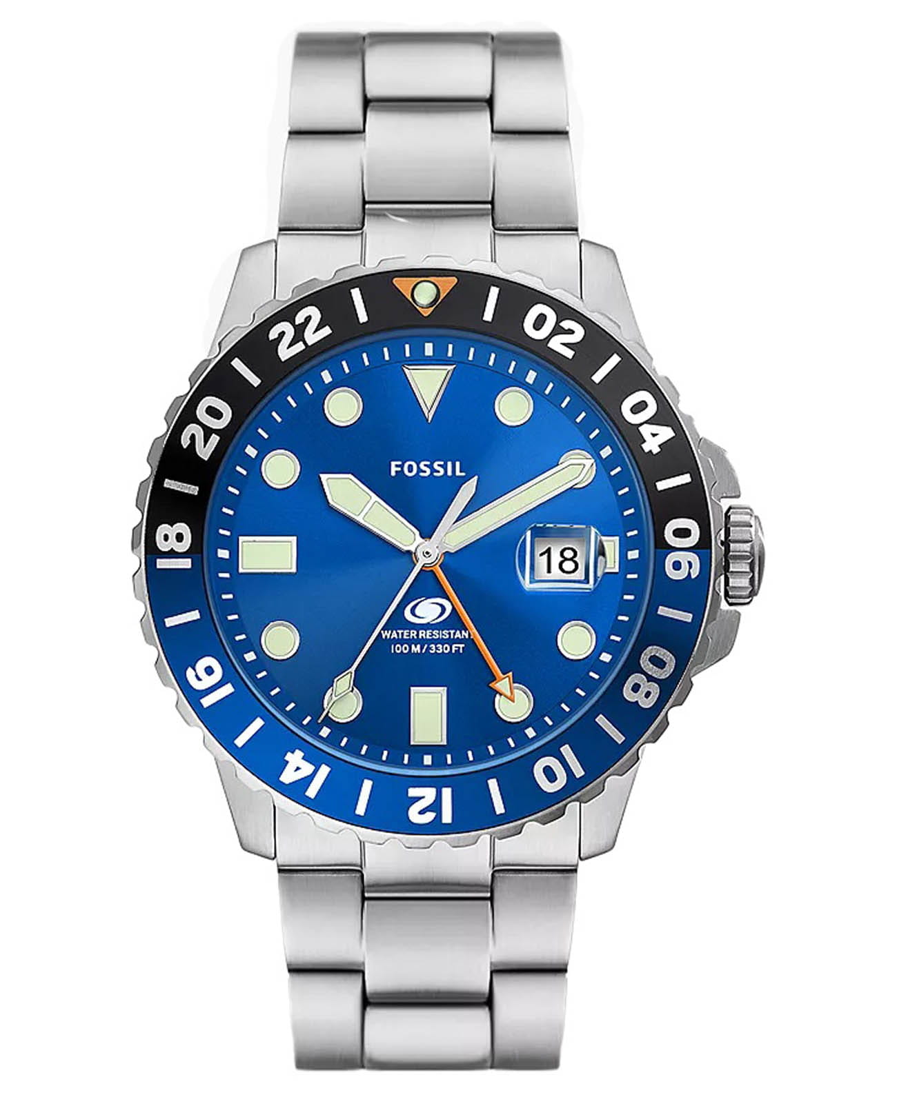 Мужские американские часы с минеральным стекломМинеральное стеклоМинеральное стекло представляет собой искусственно выращенный минерал кварца. Такое стекло отличается особой устойчивостью к повреждениям и царапинам. Уступает по некоторым качествам сапфировому стеклу. Fossil Blue FS5991, кварцевый механизм с высокой точностью. Корпус и браслет часов изготовлены из стали. БезельБезельВнешний ободок, закрепляющий стекло. В спортивных часах так называется поворотное кольцо с делениями на циферблате, выполняет роль таймера – замеряет отрезки времени на шкале. Неподвижный безель – элемент декора. Однонаправленно вращающийся безель на дайверских часах позволяет фиксировать моменты погружения и выныривания на поверхность. с IP-покрытиемIP-покрытиеМетод ионного напыления. Демонстрирует повышенную устойчивость к истиранию, окислению и химическим веществам. Под воздействием высокого давления и температуры около 1500°C молекулы металла надёжно соединяются с частицами корпуса часов.. Функция GMTGMTОтображение времени второго часового пояса.Такая функция особенно актуальна для путешественников и бизнесменов,которые общаются с людьми из разных стран,теперь вы всегда будете знать,какой час у вашего партнёра или близкого человека.. Окошко даты находится в положении 3 часа. Метки в виде точек и штрихов. Класс водозащиты: 100 метров, позволит плавать, нырять и заниматься другими водными видами спорта. Браслет на раскладной застёжкеРаскладная застёжкаТакой тип застёжки используется только на браслетах из металла. Она никогда не раскрывается полностью, происходит разделение на 2 и более частей. Раскладывающая застёжка снизит вероятность потери часов к минимуму..