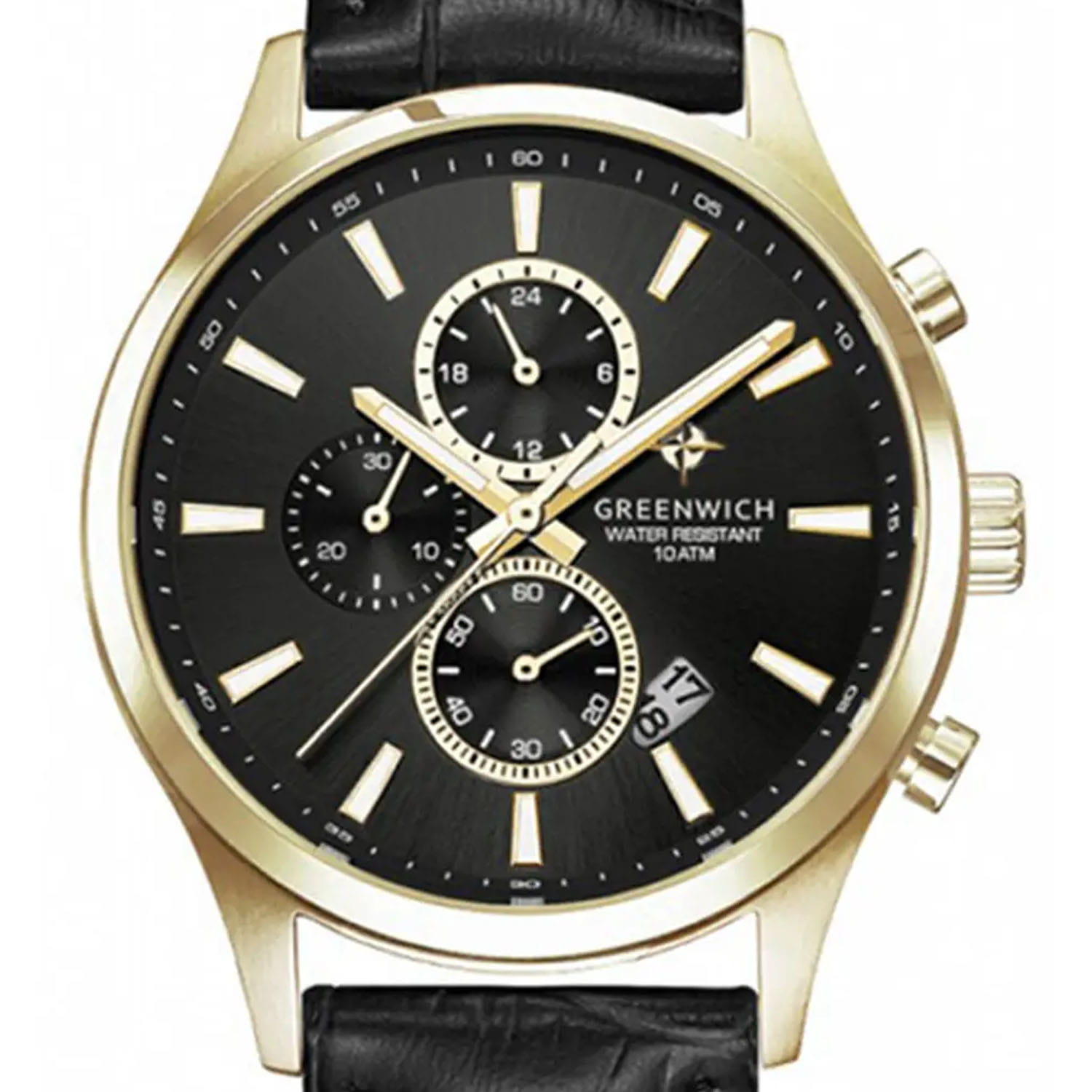 Мужские наручные часы-хронографХронографФункция позволяет измерять отрезки времени с особой точностью: часы, минуты, секунды. Верным признаком хронографа является наличие на циферблате 3 дополнительных окошек-счётчиков. Greenwich Navigator GW 053.21.31 представляют собой классический вариант для повседневной носки. Циферблат украшается брендовым логотипом, изображающим Розу Ветров. Эмблема мореплавательского духа символизирует удачу, стремление достигнуть поставленной цели. Часы характеризуются традиционными формами, лаконичным исполнением, что делает модель элегантным дополнением к деловому костюму. Надёжный корпус из нержавеющей стали с PVD-покрытиемPVDУльтратонкое покрытие наносится в технике вакуумного напыления, сочетает в себе нитрид титана особой прочности со слоем золота или оксида хрома. Несёт в себе декоративную или защитную функцию. спасает японский механизм от повреждений и ударов. Минеральное стеклоМинеральное стеклоМинеральное стекло представляет собой искусственно выращенный минерал кварца. Такое стекло отличается особой устойчивостью к повреждениям и царапинам. Уступает по некоторым качествам сапфировому стеклу. отличается устойчивостью к образованию царапин на поверхности. СекундомерСекундомерСекундоме́р — прибор, способный измерять интервалы времени с точностью до долей секунды.. Стрелки и метки с люминесцентным покрытиемЛюминесцентное покрытиеПозволяет считывать показания времени в темноте. Производители наносят на стрелки, часовые индексы, безель или поверхность циферблата светонакопительный состав, дающий холодное свечение.. Кожаный ремешок на стандартной застёжке. Окошко даты находится в положении между 4 и 5 часов. Класс водозащиты: 100 метров, позволит плавать, нырять и заниматься другими водными видами спорта.