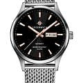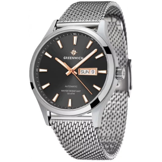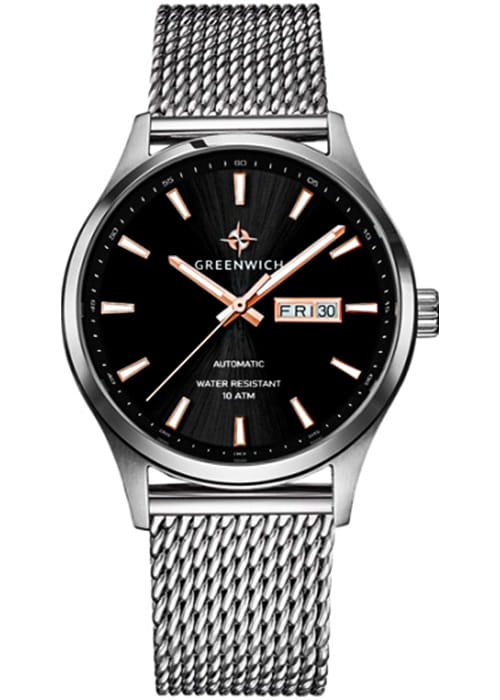 Мужские механические часы с автоподзаводом Greenwich GW 054.19.30 из коллекции Good Luck — это сочетание классического дизайна, швейцарского качества и надёжного механизма. Корпус диаметром 43 мм выполнен из нержавеющей стали 316L с полированным безелемБезельВнешний ободок, закрепляющий стекло. В спортивных часах так называется поворотное кольцо с делениями на циферблате, выполняет роль таймера – замеряет отрезки времени на шкале. Неподвижный безель – элемент декора. Однонаправленно вращающийся безель на дайверских часах позволяет фиксировать моменты погружения и выныривания на поверхность.. Циферблат чёрного цвета с эффектом «солнечных лучей» защищён минеральным стекломМинеральное стеклоМинеральное стекло представляет собой искусственно выращенный минерал кварца. Такое стекло отличается особой устойчивостью к повреждениям и царапинам. Уступает по некоторым качествам сапфировому стеклу. и дополнен сдвоенным окошком даты и индикацией дня недели. Часовая и минутная стрелки оснащены люминесцентным покрытиемЛюминесцентное покрытиеПозволяет считывать показания времени в темноте. Производители наносят на стрелки, часовые индексы, безель или поверхность циферблата светонакопительный состав, дающий холодное свечение., обеспечивающим хорошую читаемость в темноте. Механизм — японский автомат TMI с декорированным ротором, на котором выгравированы парусник и название коллекции. Прозрачная задняя крышка позволяет наблюдать за работой механизма. Браслет из нержавеющей стали выполнен в технике миланского плетения и оснащён удобной застёжкой с возможностью точной регулировки. Водонепроницаемость 100 м позволяет использовать часы для плавания и других водных видов спорта.