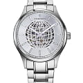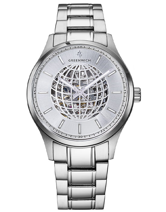 Мужские механические часы с минеральным стекломМинеральное стеклоМинеральное стекло представляет собой искусственно выращенный минерал кварца. Такое стекло отличается особой устойчивостью к повреждениям и царапинам. Уступает по некоторым качествам сапфировому стеклу. Greenwich Globe GW 056.10.33. Корпус часов изготовлен из стали. Стрелки с люминесцентным покрытиемЛюминесцентное покрытиеПозволяет считывать показания времени в темноте. Производители наносят на стрелки, часовые индексы, безель или поверхность циферблата светонакопительный состав, дающий холодное свечение.. Класс водозащиты: 100 метров, позволит плавать, нырять и заниматься другими водными видами спорта. Стальной браслет на раскладной застёжкеРаскладная застёжкаТакой тип застёжки используется только на браслетах из металла. Она никогда не раскрывается полностью, происходит разделение на 2 и более частей. Раскладывающая застёжка снизит вероятность потери часов к минимуму..