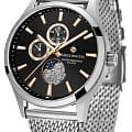 Мужские наручные часы Greenwich Moon Walker GW 058.19.35 представляют собой классический вариант для повседневной носки. Циферблат украшается брендовым логотипом, изображающим Розу Ветров. Эмблема мореплавательского духа символизирует удачу, стремление достигнуть поставленной цели. Часы характеризуются традиционными формами, лаконичным исполнением, что делает модель элегантным дополнением к деловому костюму. Надёжный корпус из нержавеющей стали спасает японский механизм от повреждений и ударов. Минеральное стеклоМинеральное стеклоМинеральное стекло представляет собой искусственно выращенный минерал кварца. Такое стекло отличается особой устойчивостью к повреждениям и царапинам. Уступает по некоторым качествам сапфировому стеклу. отличается устойчивостью к образованию царапин на поверхности. Стрелки и метки с люминесцентным покрытиемЛюминесцентное покрытиеПозволяет считывать показания времени в темноте. Производители наносят на стрелки, часовые индексы, безель или поверхность циферблата светонакопительный состав, дающий холодное свечение.. Лунный календарь находится в позиции 6 часов. Стальной браслет миланского плетения на раскладной застёжкеРаскладная застёжкаТакой тип застёжки используется только на браслетах из металла. Она никогда не раскрывается полностью, происходит разделение на 2 и более частей. Раскладывающая застёжка снизит вероятность потери часов к минимуму..