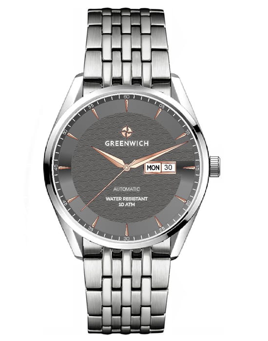 Мужские часы с минеральным стекломМинеральное стеклоМинеральное стекло представляет собой искусственно выращенный минерал кварца. Такое стекло отличается особой устойчивостью к повреждениям и царапинам. Уступает по некоторым качествам сапфировому стеклу. Greenwich Good Luck Classic GW 074.12.34, представляют собой классический вариант для повседневной носки. В центральной части циферблата — отличительная черта моделей этой серии: гильоше, объемные линии которого напоминают волны. Обратите внимание на форму пластины, где крепятся накладные риски: она сделана в форме латинской буквы G, первой буквы в названии бренда. Часы характеризуются традиционными формами, лаконичным исполнением, что делает модель элегантным дополнением к деловому костюму. Сквозь прозрачную заднюю крышку вы увидите детали механизма TMI с декорированным ротором: на нем выгравировано изображение символа английских моряков — парусника. Браслет и застежка-клипса выполнены из гипоаллергенной нержавеющей стали. Дизайн, актуальный для любого современного образа, и надежность используемых материалов делают автоматические часы Greenwich удобным и стильным аксессуаром на каждый день.