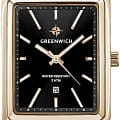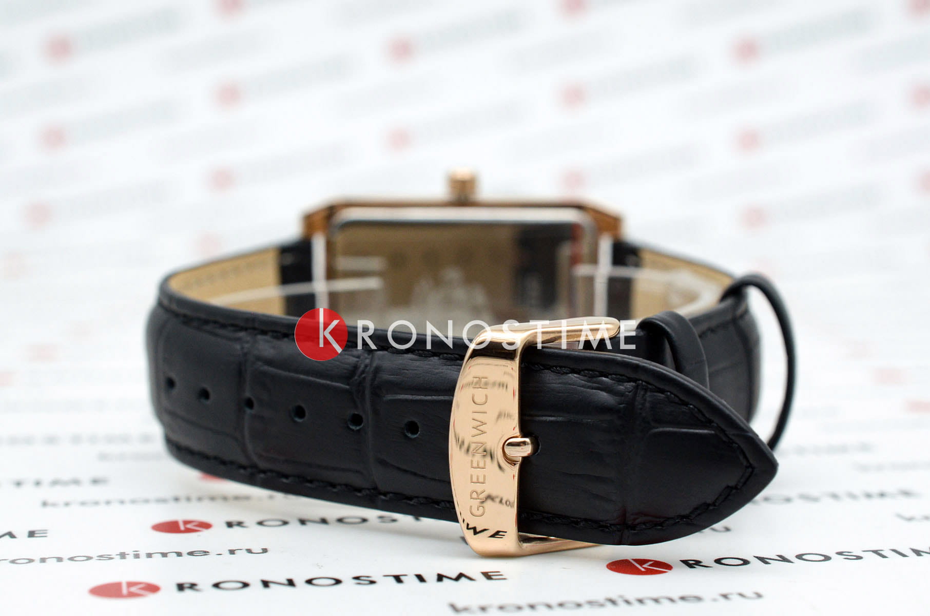 Часы Greenwich GW 571.41.11 из коллекции Galeon — элегантная мужская модель, сочетающая классический дизайн и современные технологии. Корпус размером 33 x 40 мм выполнен из гипоаллергенной нержавеющей стали с PVD-покрытиемPVDУльтратонкое покрытие наносится в технике вакуумного напыления, сочетает в себе нитрид титана особой прочности со слоем золота или оксида хрома. Несёт в себе декоративную или защитную функцию. из розового золота. Чёрный циферблат с крупными стрелками, покрытыми люминесцентным составом, защищён минеральным стекломМинеральное стеклоМинеральное стекло представляет собой искусственно выращенный минерал кварца. Такое стекло отличается особой устойчивостью к повреждениям и царапинам. Уступает по некоторым качествам сапфировому стеклу.. Окошко даты расположено в позиции «6 часов».