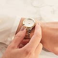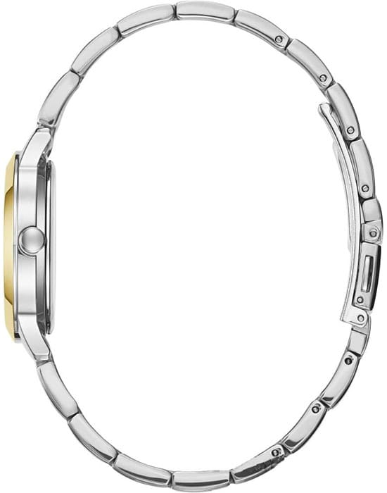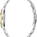 Серебристый компактный циферблат не имеет ни одной лишней детали, присутствуют лишь стрелки и оригинальная часовая разметка. Необычным оформлением отличается и браслет, для изготовления которого была использована нержавеющая сталь 316L. Кварцевый механизм работает от батарейки, имеющей продолжительный срок службы. Частичное IP-покрытиеIP-покрытиеМетод ионного напыления. Демонстрирует повышенную устойчивость к истиранию, окислению и химическим веществам. Под воздействием высокого давления и температуры около 1500°C молекулы металла надёжно соединяются с частицами корпуса часов. золотистого цвета. Минеральное стекло устойчиво к образованию царапин. Водозащита до 3 бар. Диаметр корпуса: 30 мм.