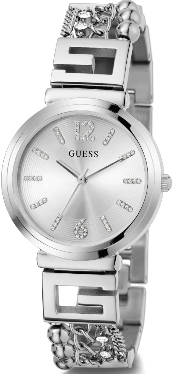 Женские кварцевые наручные часы с минеральным стекломМинеральное стеклоМинеральное стекло представляет собой искусственно выращенный минерал кварца. Такое стекло отличается особой устойчивостью к повреждениям и царапинам. Уступает по некоторым качествам сапфировому стеклу. Guess G Cluster GW0545L1, кварцевый механизм с высокой точностью. Класс водозащиты: 30 метров, позволит защитить корпус от случайных брызг или капель дождя. Корпус часов изготовлен из стали. Стальной браслет на ювелирной застёжке. Циферблат инкрустирован кристаллами.