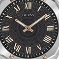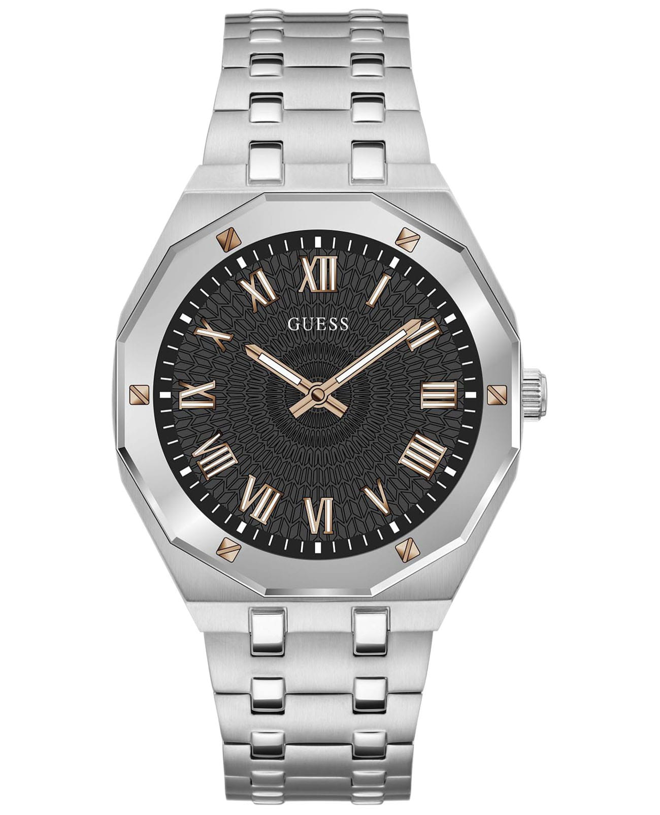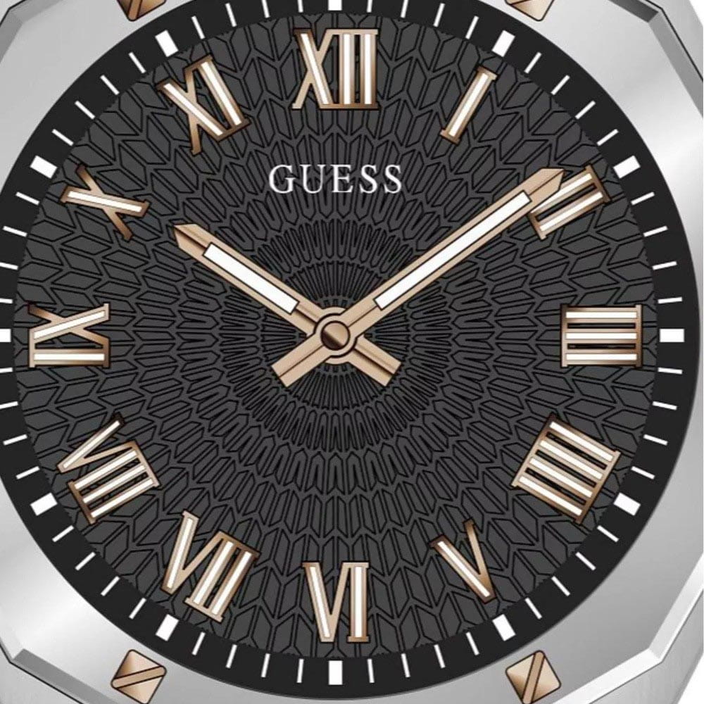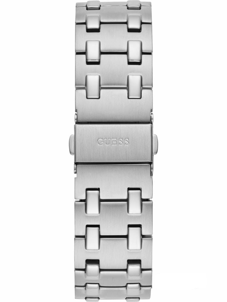 Мужские наручные часы Guess Asset GW0575G1 с минеральным стекломМинеральное стеклоМинеральное стекло представляет собой искусственно выращенный минерал кварца. Такое стекло отличается особой устойчивостью к повреждениям и царапинам. Уступает по некоторым качествам сапфировому стеклу., кварцевый механизм с высокой точностью. Класс водозащиты: 50 метров, позволит защитить корпус от случайных брызг или капель дождя. Корпус часов и безельБезельВнешний ободок, закрепляющий стекло. В спортивных часах так называется поворотное кольцо с делениями на циферблате, выполняет роль таймера – замеряет отрезки времени на шкале. Неподвижный безель – элемент декора. Однонаправленно вращающийся безель на дайверских часах позволяет фиксировать моменты погружения и выныривания на поверхность. изготовлены из стали. Стальной браслет на раскладной застёжкеРаскладная застёжкаТакой тип застёжки используется только на браслетах из металла. Она никогда не раскрывается полностью, происходит разделение на 2 и более частей. Раскладывающая застёжка снизит вероятность потери часов к минимуму.. Гильошированный циферблат. Метки в виде римских цифр. Рифленая заводная головка. Стрелки с люминесцентным покрытиемЛюминесцентное покрытиеПозволяет считывать показания времени в темноте. Производители наносят на стрелки, часовые индексы, безель или поверхность циферблата светонакопительный состав, дающий холодное свечение..