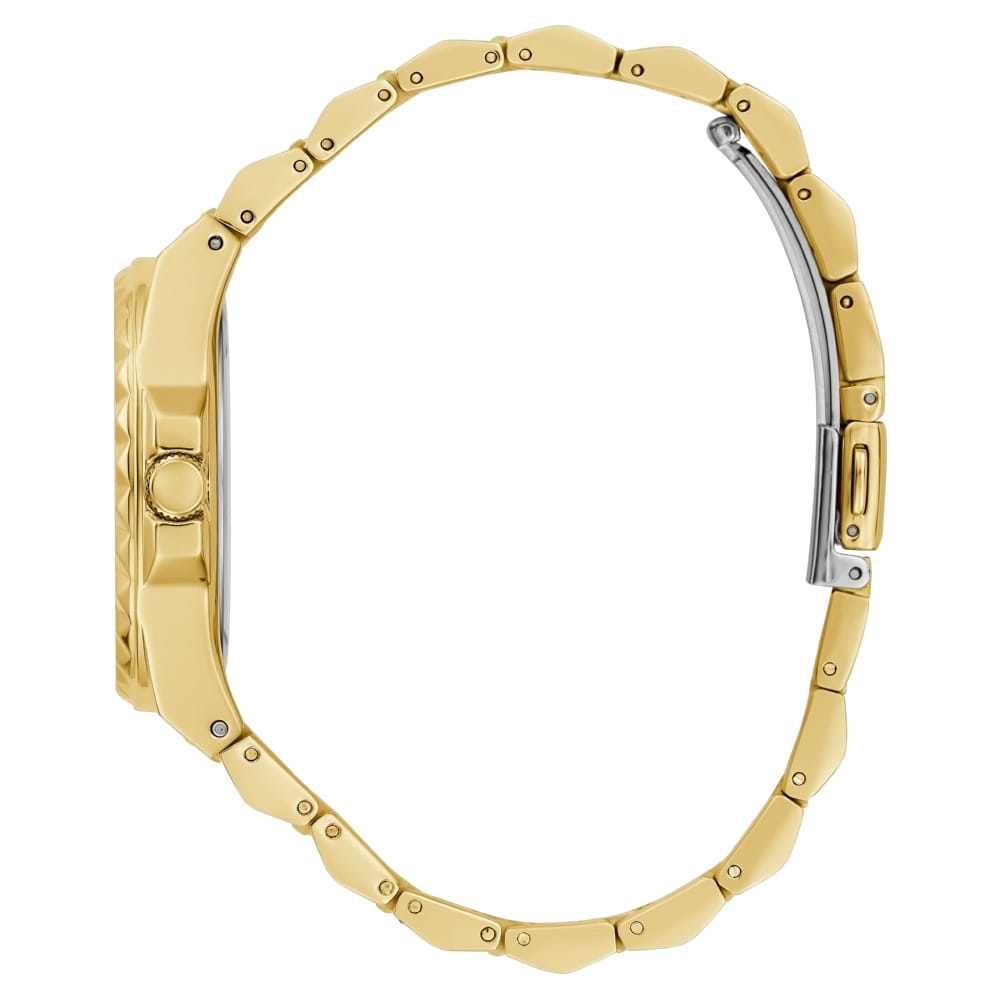 Женские наручные часы с минеральным стекломМинеральное стеклоМинеральное стекло представляет собой искусственно выращенный минерал кварца. Такое стекло отличается особой устойчивостью к повреждениям и царапинам. Уступает по некоторым качествам сапфировому стеклу. Guess Lady Idol GW0601L1, кварцевый механизм с высокой точностью. Класс водозащиты: 30 метров, позволит защитить корпус от случайных брызг или капель дождя. Корпус часов изготовлен из стали с IP-покрытиемIP-покрытиеМетод ионного напыления. Демонстрирует повышенную устойчивость к истиранию, окислению и химическим веществам. Под воздействием высокого давления и температуры около 1500°C молекулы металла надёжно соединяются с частицами корпуса часов.. Стальной браслет на раскладной застёжкеРаскладная застёжкаТакой тип застёжки используется только на браслетах из металла. Она никогда не раскрывается полностью, происходит разделение на 2 и более частей. Раскладывающая застёжка снизит вероятность потери часов к минимуму. с IP-покрытиемIP-покрытиеМетод ионного напыления. Демонстрирует повышенную устойчивость к истиранию, окислению и химическим веществам. Под воздействием высокого давления и температуры около 1500°C молекулы металла надёжно соединяются с частицами корпуса часов.. БезельБезельВнешний ободок, закрепляющий стекло. В спортивных часах так называется поворотное кольцо с делениями на циферблате, выполняет роль таймера – замеряет отрезки времени на шкале. Неподвижный безель – элемент декора. Однонаправленно вращающийся безель на дайверских часах позволяет фиксировать моменты погружения и выныривания на поверхность. инкрустирован кристаллами.