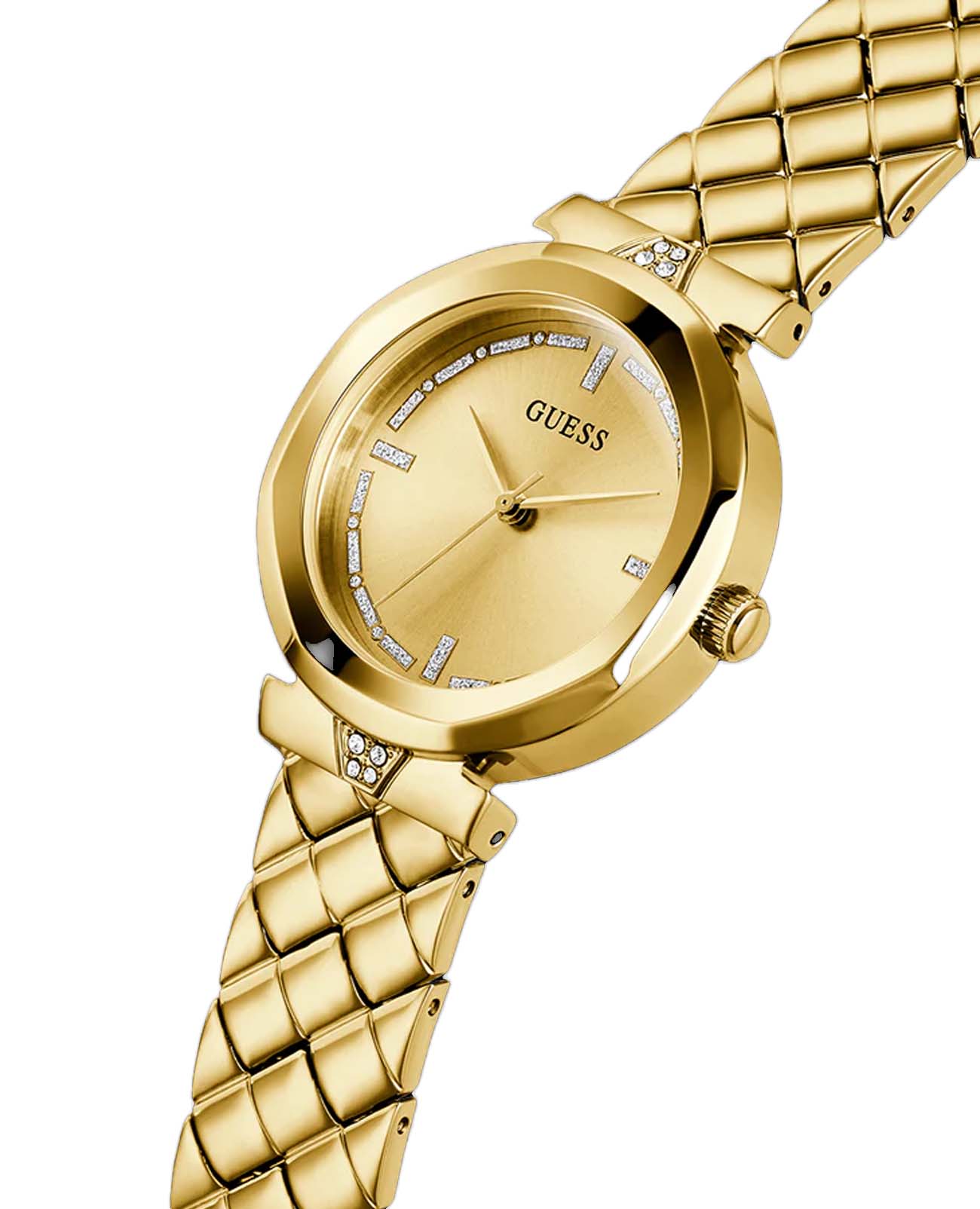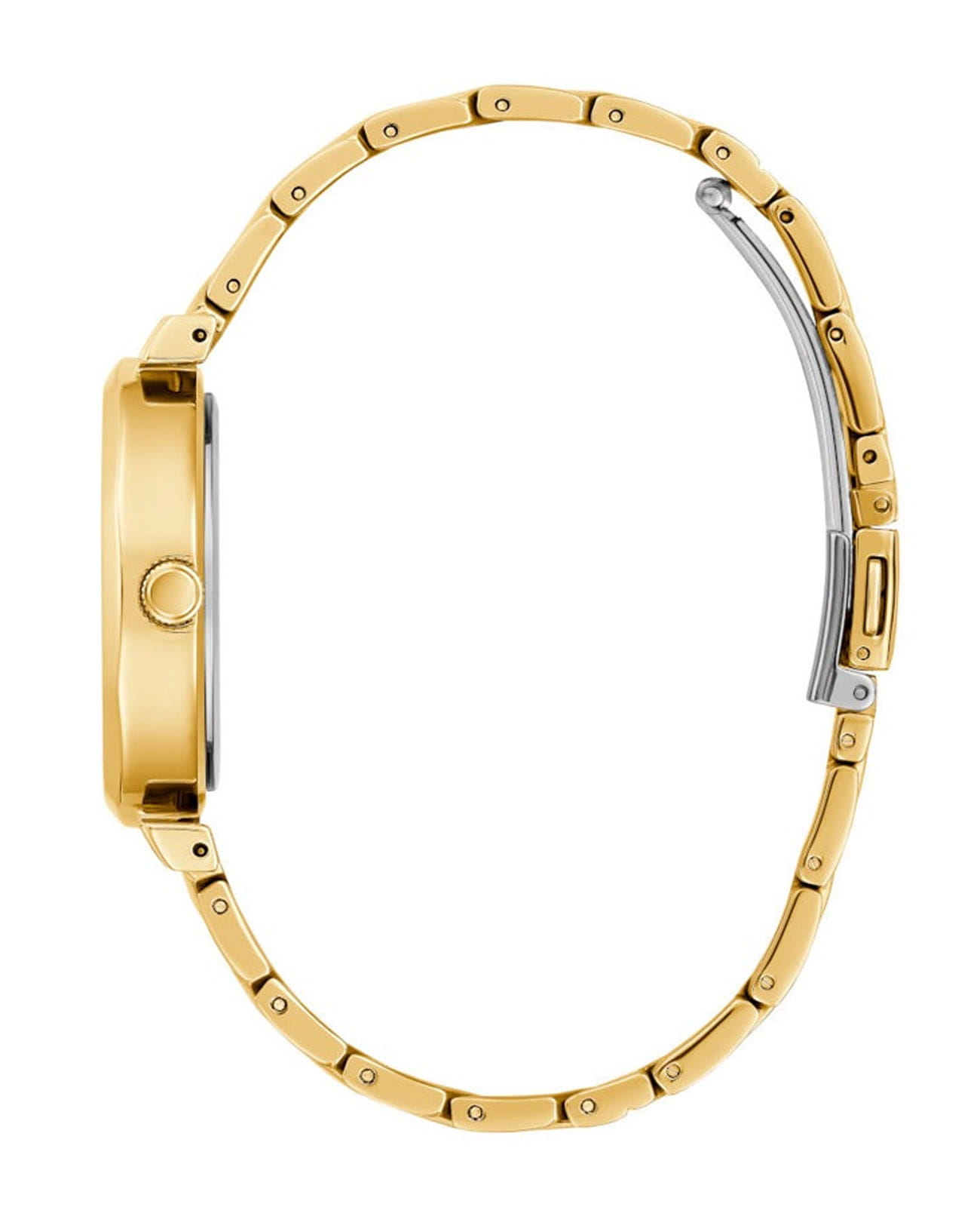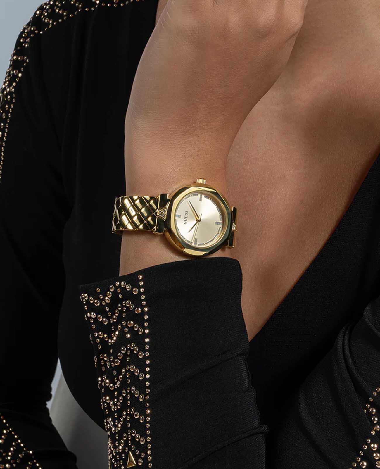 Женские наручные часы Guess GW0613L2 с минеральным стекломМинеральное стеклоМинеральное стекло представляет собой искусственно выращенный минерал кварца. Такое стекло отличается особой устойчивостью к повреждениям и царапинам. Уступает по некоторым качествам сапфировому стеклу., кварцевый механизм с высокой точностью. Корпус часов изготовлен из стали с PVD-покрытиемPVDУльтратонкое покрытие наносится в технике вакуумного напыления, сочетает в себе нитрид титана особой прочности со слоем золота или оксида хрома. Несёт в себе декоративную или защитную функцию.. Циферблат украшен кристаллами. Рифленая заводная головка. Класс водозащиты: 30 метров, позволит защитить корпус от случайных брызг или капель дождя. Браслет с PVD-покрытиемPVDУльтратонкое покрытие наносится в технике вакуумного напыления, сочетает в себе нитрид титана особой прочности со слоем золота или оксида хрома. Несёт в себе декоративную или защитную функцию. на раскладной застёжкеРаскладная застёжкаТакой тип застёжки используется только на браслетах из металла. Она никогда не раскрывается полностью, происходит разделение на 2 и более частей. Раскладывающая застёжка снизит вероятность потери часов к минимуму..