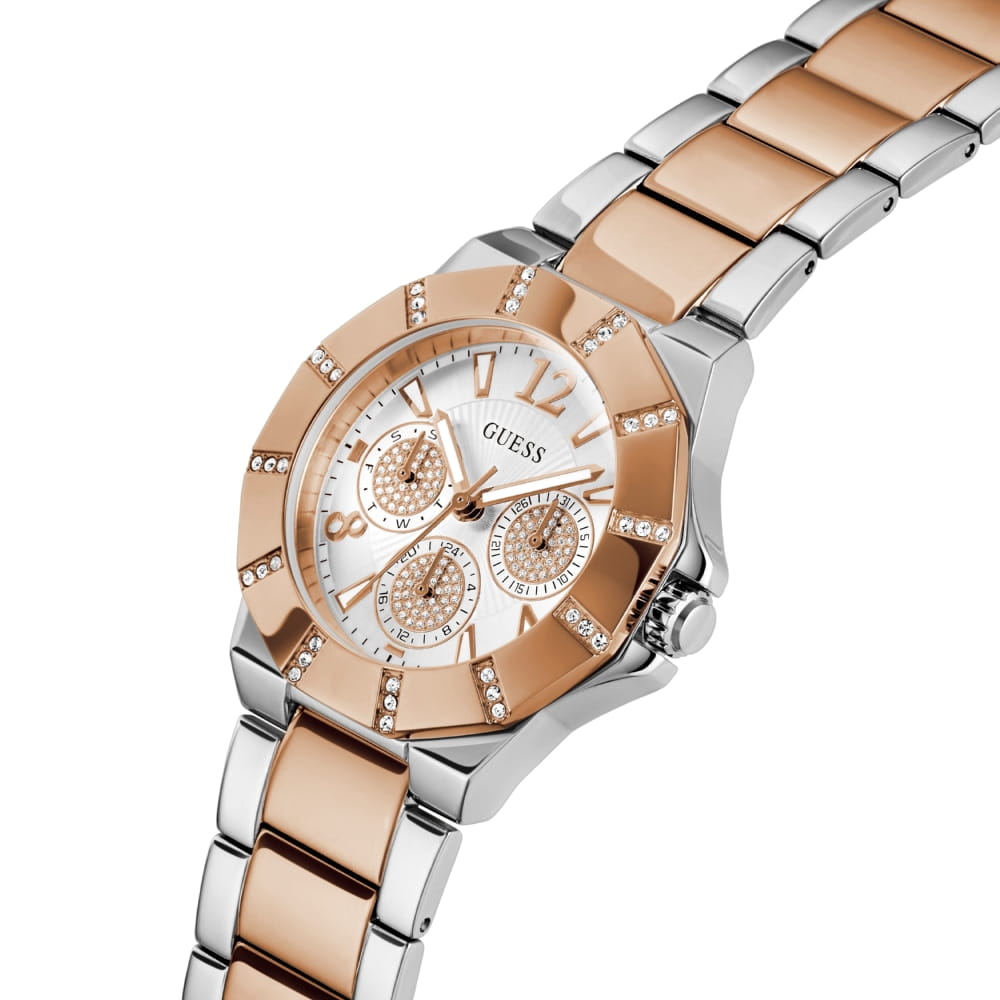 Женские наручные часы с минеральным стекломМинеральное стеклоМинеральное стекло представляет собой искусственно выращенный минерал кварца. Такое стекло отличается особой устойчивостью к повреждениям и царапинам. Уступает по некоторым качествам сапфировому стеклу. Guess Sport lady GW0616L3, кварцевый механизм с высокой точностью. Класс водозащиты: 30 метров, позволит защитить корпус от случайных брызг или капель дождя. Корпус часов изготовлен из стали. Стальной браслет на раскладной застёжкеРаскладная застёжкаТакой тип застёжки используется только на браслетах из металла. Она никогда не раскрывается полностью, происходит разделение на 2 и более частей. Раскладывающая застёжка снизит вероятность потери часов к минимуму. с IP-покрытиемIP-покрытиеМетод ионного напыления. Демонстрирует повышенную устойчивость к истиранию, окислению и химическим веществам. Под воздействием высокого давления и температуры около 1500°C молекулы металла надёжно соединяются с частицами корпуса часов..БезельБезельВнешний ободок, закрепляющий стекло. В спортивных часах так называется поворотное кольцо с делениями на циферблате, выполняет роль таймера – замеряет отрезки времени на шкале. Неподвижный безель – элемент декора. Однонаправленно вращающийся безель на дайверских часах позволяет фиксировать моменты погружения и выныривания на поверхность. с IP-покрытиемIP-покрытиеМетод ионного напыления. Демонстрирует повышенную устойчивость к истиранию, окислению и химическим веществам. Под воздействием высокого давления и температуры около 1500°C молекулы металла надёжно соединяются с частицами корпуса часов. инкрустирован кристаллами. Стрелки и метки с люминесцентным покрытиемЛюминесцентное покрытиеПозволяет считывать показания времени в темноте. Производители наносят на стрелки, часовые индексы, безель или поверхность циферблата светонакопительный состав, дающий холодное свечение..