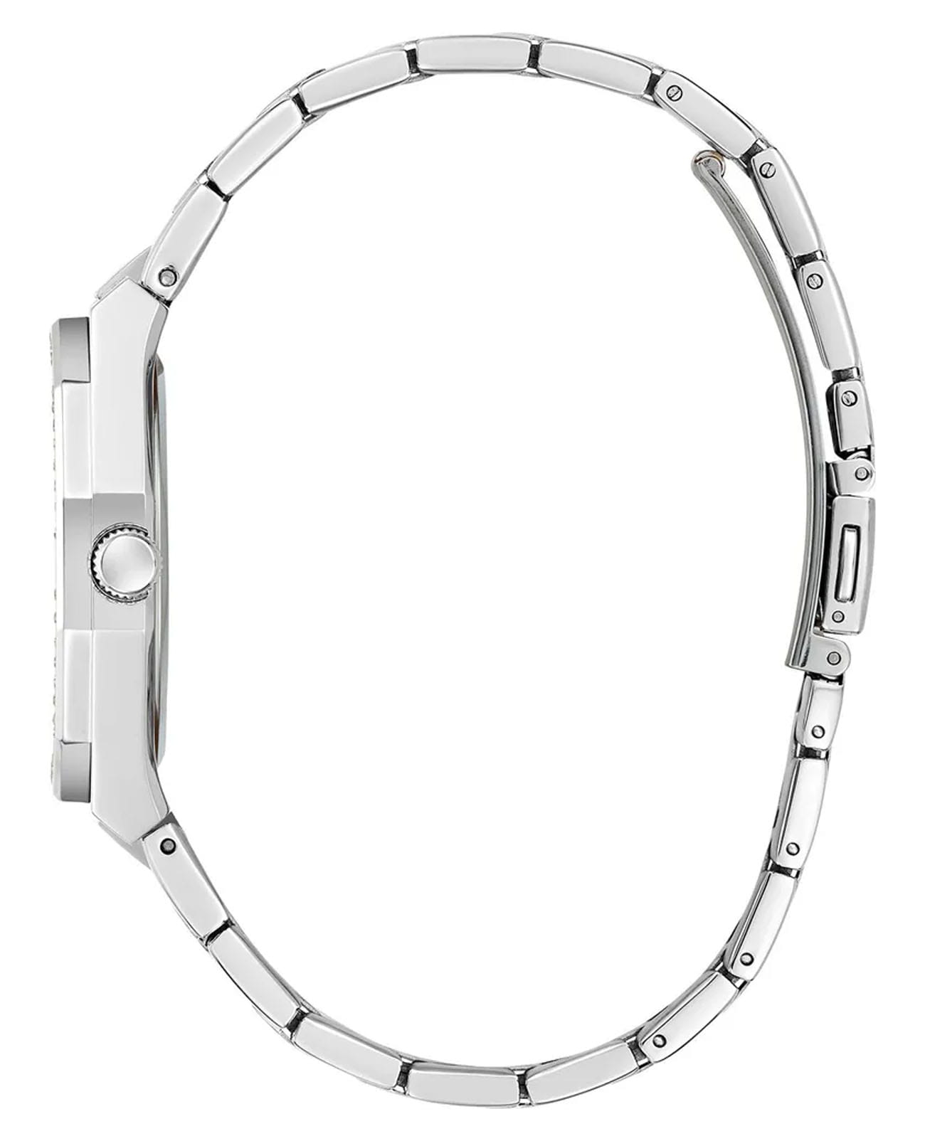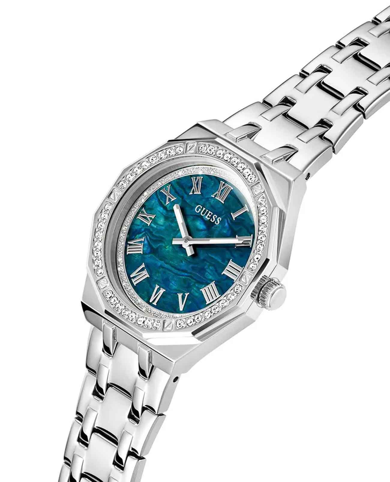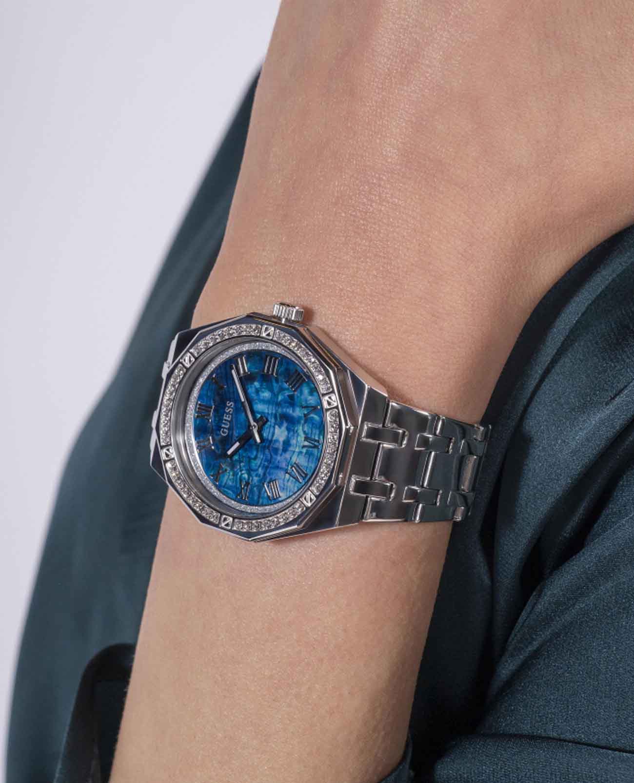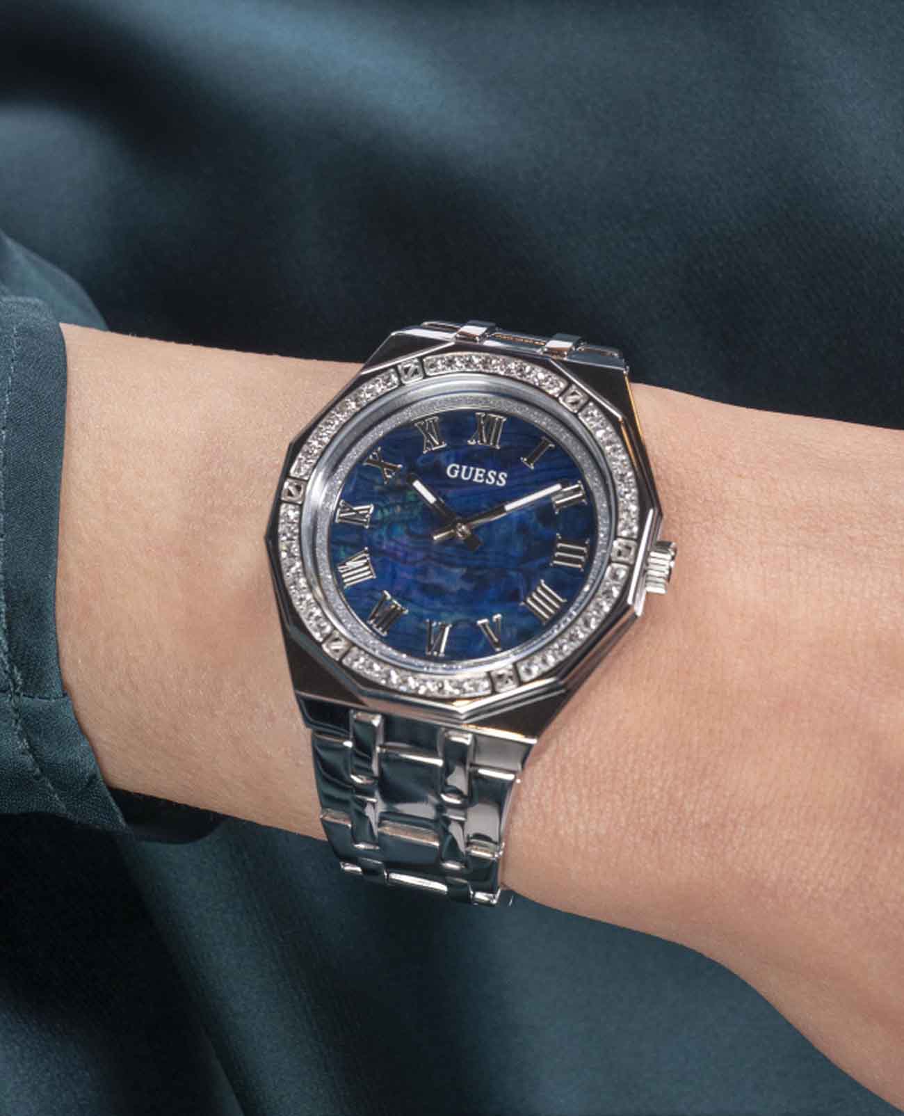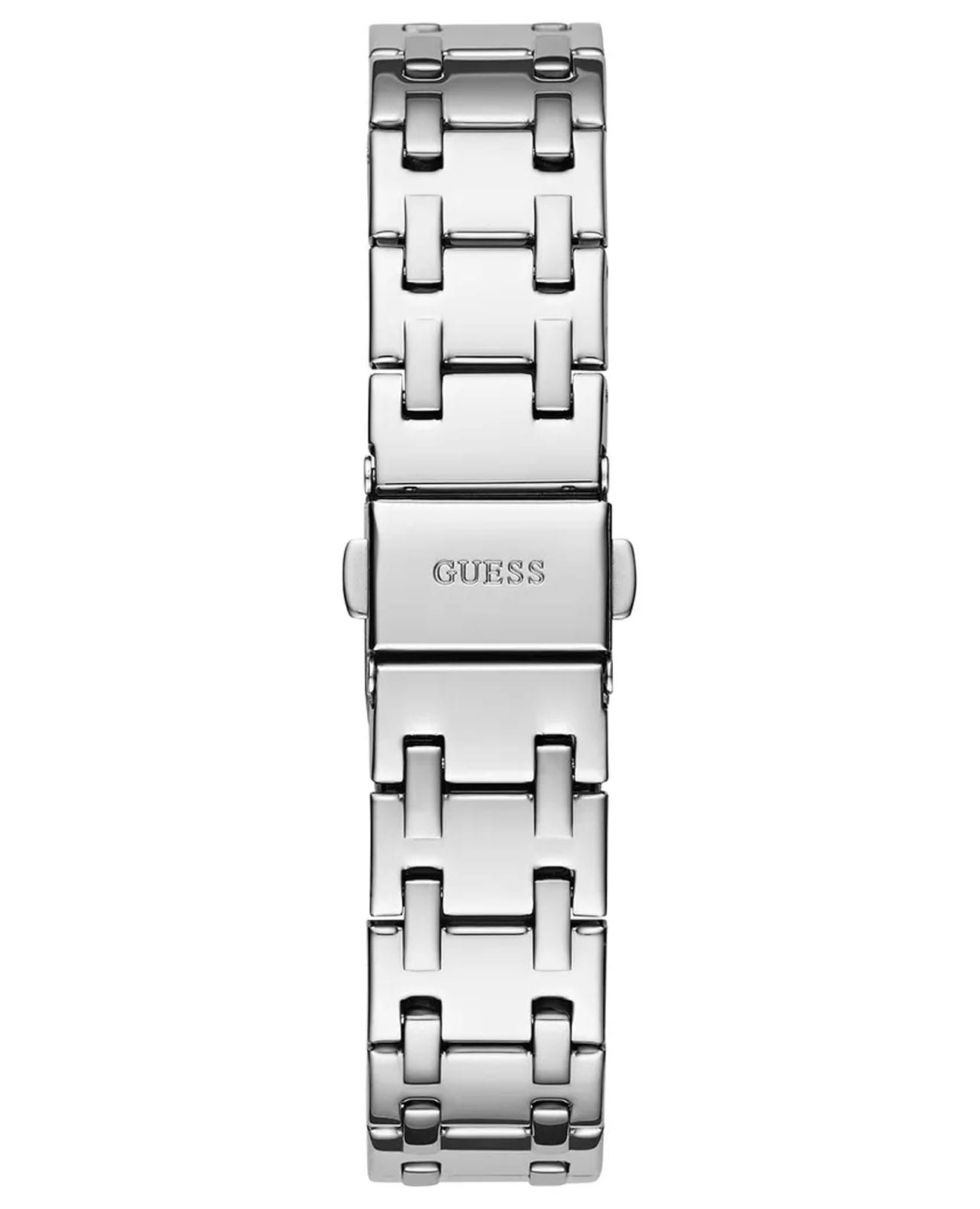 Женские наручные часы Guess Dress GW0770L1 с минеральным стекломМинеральное стеклоМинеральное стекло представляет собой искусственно выращенный минерал кварца. Такое стекло отличается особой устойчивостью к повреждениям и царапинам. Уступает по некоторым качествам сапфировому стеклу., кварцевый механизм с высокой точностью. Корпус часов изготовлен из стали. БезельБезельВнешний ободок, закрепляющий стекло. В спортивных часах так называется поворотное кольцо с делениями на циферблате, выполняет роль таймера – замеряет отрезки времени на шкале. Неподвижный безель – элемент декора. Однонаправленно вращающийся безель на дайверских часах позволяет фиксировать моменты погружения и выныривания на поверхность. украшен кристаллами. Стрелки с люминесцентным покрытиемЛюминесцентное покрытиеПозволяет считывать показания времени в темноте. Производители наносят на стрелки, часовые индексы, безель или поверхность циферблата светонакопительный состав, дающий холодное свечение.. Класс водозащиты: 50 метров, позволит защитить корпус от случайных брызг или капель дождя. Стальной браслет на раскладной застёжкеРаскладная застёжкаТакой тип застёжки используется только на браслетах из металла. Она никогда не раскрывается полностью, происходит разделение на 2 и более частей. Раскладывающая застёжка снизит вероятность потери часов к минимуму..