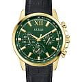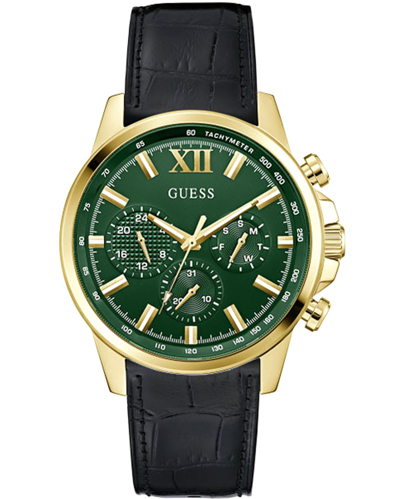 Стильные и функциональные часы Guess GW0901G4 оснащены кварцевым механизмом, что обеспечивает точность и надежность в использовании. Корпус выполнен из прочной стали с золотистым PVD-покрытиемPVDУльтратонкое покрытие наносится в технике вакуумного напыления, сочетает в себе нитрид титана особой прочности со слоем золота или оксида хрома. Несёт в себе декоративную или защитную функцию., придающей изделиям утонченный и современный вид. Циферблат украшен метками в виде штрихов и римской цифрой XII, обеспечивающими легкое считывание времени. Время отображается в двух форматах — 12-ти и 24-х часовом, что удобно для тех, кто привык к разным системам времени. Дополнительные циферблаты показывают дату и день недели, что позволяет всегда быть в курсе текущей даты без необходимости использования других устройств. Часы также оснащены тахиметромТахиметрРазмеченная шкала, располагается на ободке или безеле часов. Тахиметр позволяет рассчитать скорость на определённом участке пути, расстояние измеряется в километрах или милях., что добавляет им функциональности и может быть полезно для измерения скорости. Люминесцентное покрытиеЛюминесцентное покрытиеПозволяет считывать показания времени в темноте. Производители наносят на стрелки, часовые индексы, безель или поверхность циферблата светонакопительный состав, дающий холодное свечение. на стрелках и метках обеспечивает отличную видимость в темноте. Минеральное стеклоМинеральное стеклоМинеральное стекло представляет собой искусственно выращенный минерал кварца. Такое стекло отличается особой устойчивостью к повреждениям и царапинам. Уступает по некоторым качествам сапфировому стеклу. защищает циферблат от царапин и повреждений, а водозащита 50WR позволяет не волноваться о случайных контактах с водой, например, во время дождя. Кожаный черный ремешок с классической застежкой обеспечивает надежную фиксацию часов на руке и комфорт в ношении. Рифленая заводная головка с защитой добавляет изысканности и одновременно защищает механизм от повреждений. Эти часы идеально подойдут для тех, кто ценит стиль, функциональность и качество в одном аксессуаре.