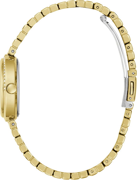 Элегантные женские наручные часы Guess GW0930L4 сочетают в себе стиль и функциональность. Эти часы оснащены точным кварцевым механизмом, что гарантирует надежность и долговечность. Корпус часов выполнен из прочной нержавеющей стали с PVD-покрытиемPVDУльтратонкое покрытие наносится в технике вакуумного напыления, сочетает в себе нитрид титана особой прочности со слоем золота или оксида хрома. Несёт в себе декоративную или защитную функцию. золотистого цвета, диаметром 28 мм, а безельБезельВнешний ободок, закрепляющий стекло. В спортивных часах так называется поворотное кольцо с делениями на циферблате, выполняет роль таймера – замеряет отрезки времени на шкале. Неподвижный безель – элемент декора. Однонаправленно вращающийся безель на дайверских часах позволяет фиксировать моменты погружения и выныривания на поверхность. украшен изысканными кристаллами, придающими им роскошный вид. Циферблат добавляет изделию утонченности и особого шарма. Часы оснащены стальным браслетом с PVD-покрытиемPVDУльтратонкое покрытие наносится в технике вакуумного напыления, сочетает в себе нитрид титана особой прочности со слоем золота или оксида хрома. Несёт в себе декоративную или защитную функцию. на раскладной застёжкеРаскладная застёжкаТакой тип застёжки используется только на браслетах из металла. Она никогда не раскрывается полностью, происходит разделение на 2 и более частей. Раскладывающая застёжка снизит вероятность потери часов к минимуму., которая обеспечивает комфортное прилегание к запястью и надежную фиксацию. Минеральное стеклоМинеральное стеклоМинеральное стекло представляет собой искусственно выращенный минерал кварца. Такое стекло отличается особой устойчивостью к повреждениям и царапинам. Уступает по некоторым качествам сапфировому стеклу. защищает циферблат от царапин и повреждений, сохраняя его безупречный вид. Водозащита 30WR гарантирует защиту от случайных брызг и дождя, что делает эти часы практичным аксессуаром для повседневной жизни. Guess – это не просто аксессуар, это заявление о вашем безупречном вкусе и стремлении к совершенству.