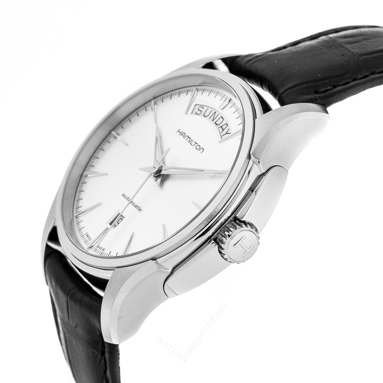 Мужские швейцарские механические часы с автоподзаводом Hamilton Jazzmaster Day Date Auto H32505751. Сапфировое стеклоСапфировое стеклоПрочный и надёжный материал из кристалла сапфира синтетического происхождения, характеризующийся особой твёрдостью и устойчивостью к царапинам и повреждениям. устойчивое к мелким механическим повреждениям. Корпус часов изготовлен из нержавеющей стали. Кожаный ремешок на стандартной застёжке. Класс водозащиты: 50 метров, позволит защитить корпус от случайных брызг или капель дождя. Стрелки и метки с люминесцентным покрытиемЛюминесцентное покрытиеПозволяет считывать показания времени в темноте. Производители наносят на стрелки, часовые индексы, безель или поверхность циферблата светонакопительный состав, дающий холодное свечение.. Окошко даты находится в положении 6 часов. Индикация дня недели в области 12 часов.