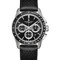 Модели из линии Jazzmaster Performer, привлекающие внимание ярким дизайном в стиле спортивный шик, сочетают в себе функциональность и эстетичность. Часы Jazzmaster Performer Automatic Chronograph оснащены автоматическим механизмом хронографаХронографФункция позволяет измерять отрезки времени с особой точностью: часы, минуты, секунды. Верным признаком хронографа является наличие на циферблате 3 дополнительных окошек-счётчиков. H-31 с 60-часовым запасом хода. Модель в корпусе из нержавеющей стали с PVD-покрытиемPVDУльтратонкое покрытие наносится в технике вакуумного напыления, сочетает в себе нитрид титана особой прочности со слоем золота или оксида хрома. Несёт в себе декоративную или защитную функцию. диаметром 42 мм имеет изящный черный циферблат и сочетающийся с безелем БезельВнешний ободок, закрепляющий стекло. В спортивных часах так называется поворотное кольцо с делениями на циферблате, выполняет роль таймера – замеряет отрезки времени на шкале. Неподвижный безель – элемент декора. Однонаправленно вращающийся безель на дайверских часах позволяет фиксировать моменты погружения и выныривания на поверхность. перфорированный черный кожаный ремешок в гоночном стиле.