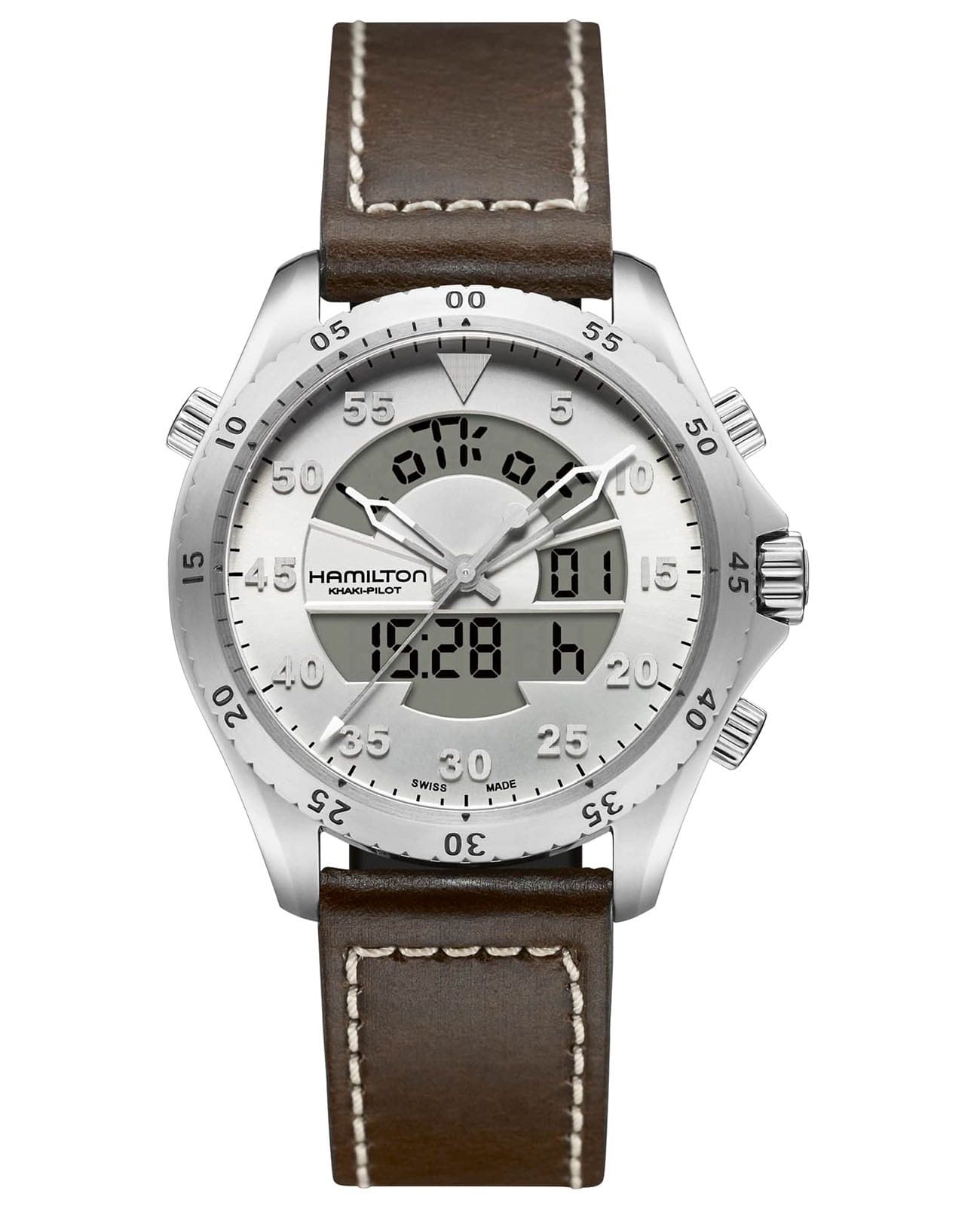 Цифровые и аналоговые дисплеи достигают новых высот благодаря Hamilton Khaki Aviation Flight Timer Quartz, сложным многофункциональным авиационным часам, которые включают в себя специальный бортовой журнал пилота для записи подробностей до 20 полетов и для каждого из них 99 посадок. Часы обладают широким спектром практичных и динамичных функций, таких как: два цифровых часовых пояса, время UTCUTCВсемирное кординационное время, не имеющее привязки к географическому положению Гринвича, основывается на атомном отсчёте времени. Регулировка времени осуществляется более точно, чем устаревшее GMT.