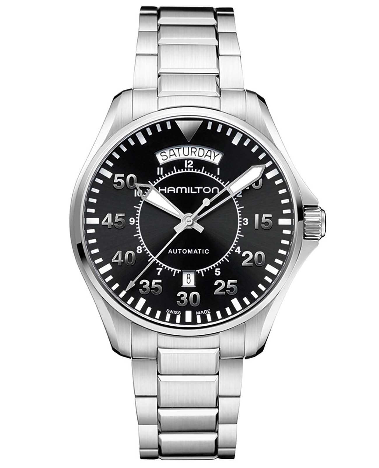 Мужские механические швейцарские часы Hamilton Khaki Aviation Pilot Day Date Auto H64615135, автоматический механизм с высокой точностью. Сапфировое стеклоСапфировое стеклоПрочный и надёжный материал из кристалла сапфира синтетического происхождения, характеризующийся особой твёрдостью и устойчивостью к царапинам и повреждениям. устойчивое к появлению царапин, обладающее высокой прозрачностью. Класс водозащиты: 100 метров, позволит плавать, нырять и заниматься другими водными видами спорта. Корпус часов изготовлен из стали. Стальной браслет на раскладной застёжкеРаскладная застёжкаТакой тип застёжки используется только на браслетах из металла. Она никогда не раскрывается полностью, происходит разделение на 2 и более частей. Раскладывающая застёжка снизит вероятность потери часов к минимуму..