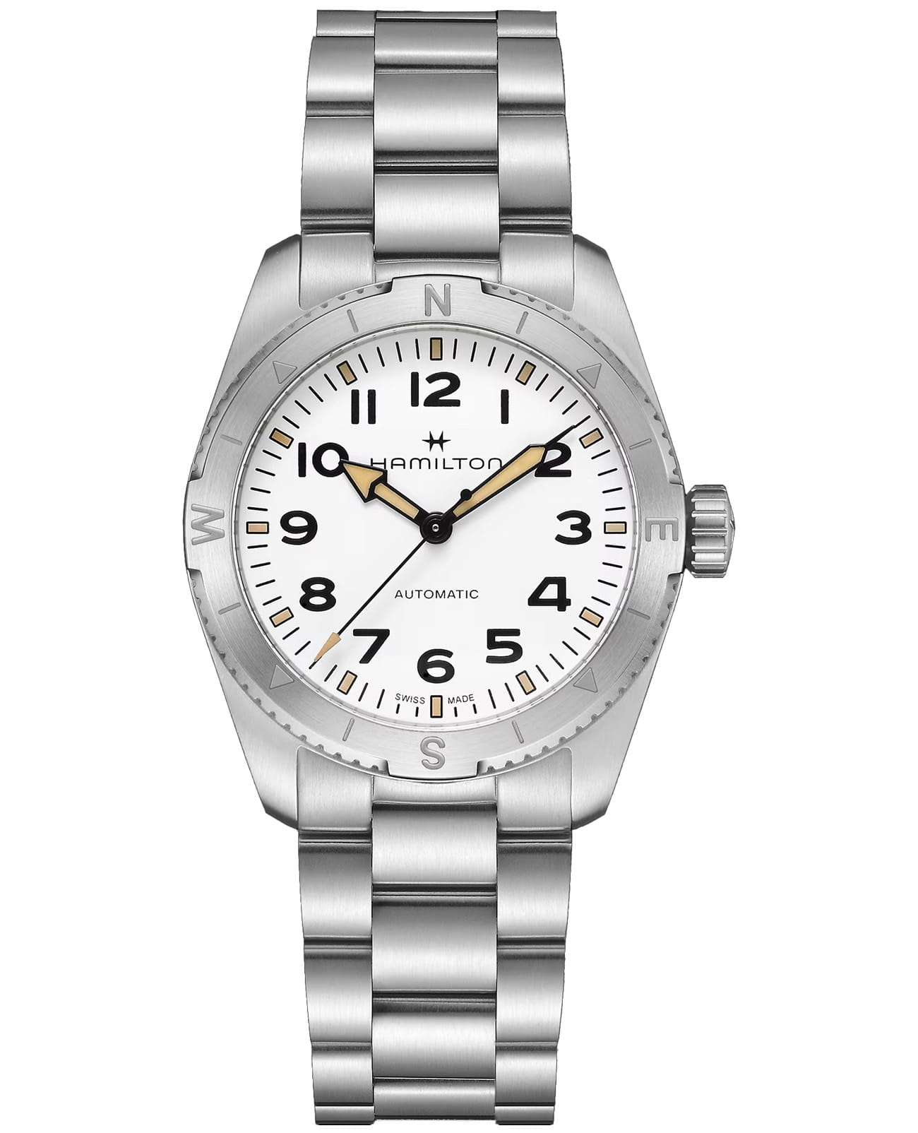 Мужские наручные часы Hamilton Khaki Field Expedition Auto H70225110 с автоматическим механизмом. Корпус часов изготовлен из нержавеющей стали. Стальной браслет на раскладной застёжкеРаскладная застёжкаТакой тип застёжки используется только на браслетах из металла. Она никогда не раскрывается полностью, происходит разделение на 2 и более частей. Раскладывающая застёжка снизит вероятность потери часов к минимуму.. Сапфировое стеклоСапфировое стеклоПрочный и надёжный материал из кристалла сапфира синтетического происхождения, характеризующийся особой твёрдостью и устойчивостью к царапинам и повреждениям. с антибликовым покрытием. Стрелки и метки с люминесцентным покрытиемЛюминесцентное покрытиеПозволяет считывать показания времени в темноте. Производители наносят на стрелки, часовые индексы, безель или поверхность циферблата светонакопительный состав, дающий холодное свечение.. Уровень влагозащиты: 100 метров, позволит плавать, нырять и заниматься другими водными видами спорта.