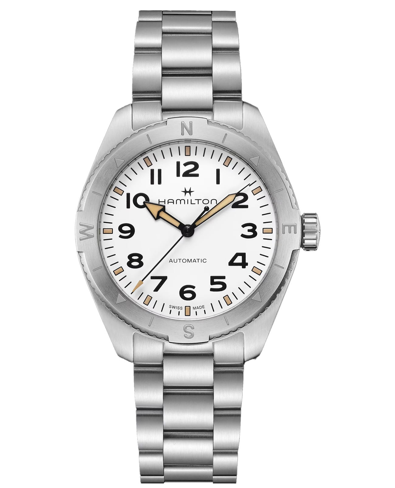 Мужские наручные часы Hamilton Khaki Field Expedition Auto H70315110 с автоматическим механизмом. Корпус часов изготовлен из нержавеющей стали. Стальной браслет на раскладной застёжкеРаскладная застёжкаТакой тип застёжки используется только на браслетах из металла. Она никогда не раскрывается полностью, происходит разделение на 2 и более частей. Раскладывающая застёжка снизит вероятность потери часов к минимуму.. Сапфировое стеклоСапфировое стеклоПрочный и надёжный материал из кристалла сапфира синтетического происхождения, характеризующийся особой твёрдостью и устойчивостью к царапинам и повреждениям. с антибликовым покрытием. Стрелки и метки с люминесцентным покрытиемЛюминесцентное покрытиеПозволяет считывать показания времени в темноте. Производители наносят на стрелки, часовые индексы, безель или поверхность циферблата светонакопительный состав, дающий холодное свечение.. Уровень влагозащиты: 100 метров, позволит плавать, нырять и заниматься другими водными видами спорта. Дизайн невероятно прочных часов Khaki Field Expedition завершает белый циферблат с пескоструйной обработкой, обеспечивающий идеальную считываемость показаний.