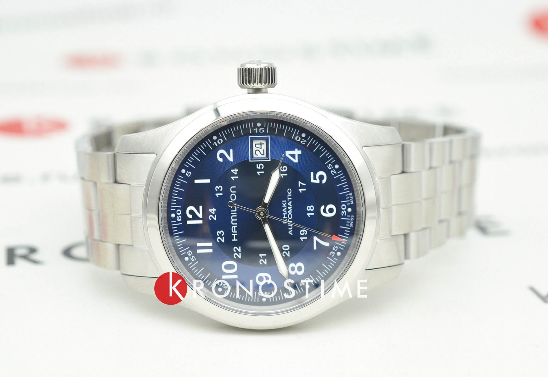 Hamilton Khaki Field Auto H70455140 — компактные полевые часы с военной эстетикой, надёжным механизмом и универсальным дизайном. Корпус диаметром 38 мм выполнен из нержавеющей стали с сатинированной отделкой. Прозрачная задняя крышка позволяет видеть работу механизма. Циферблат защищён сапфировым стекломСапфировое стеклоПрочный и надёжный материал из кристалла сапфира синтетического происхождения, характеризующийся особой твёрдостью и устойчивостью к царапинам и повреждениям. с антибликовым покрытиемАнтибликовое покрытиеСлой оксида металла в 0,13-0,3 микрон, благодаря которому стекло часов не бликует и не отражает свет. Антибликовое покрытие уменьшает отражение света в 10 раз, обеспечивая отличную читаемость показателей циферблата.. Синий циферблат с эффектом солнечных лучей оформлен в духе классических полевых часов: крупные арабские цифры, 24-часовая шкала, дата на позиции «3 часа». Стрелки и метки покрыты люминесцентным покрытиемЛюминесцентное покрытиеПозволяет считывать показания времени в темноте. Производители наносят на стрелки, часовые индексы, безель или поверхность циферблата светонакопительный состав, дающий холодное свечение. для читаемости в темноте. Внутри установлен автоматический механизм H-10 с запасом хода до 80 часов. Модель укомплектована браслетом из нержавеющей стали с раскладной застёжкойРаскладная застёжкаТакой тип застёжки используется только на браслетах из металла. Она никогда не раскрывается полностью, происходит разделение на 2 и более частей. Раскладывающая застёжка снизит вероятность потери часов к минимуму., обеспечивающей удобную посадку и надёжность. Водонепроницаемость 100 метров делает часы подходящими как для повседневной носки, так и для активного образа жизни. Khaki Field Auto 38 мм — это проверенная временем классика в современном исполнении.