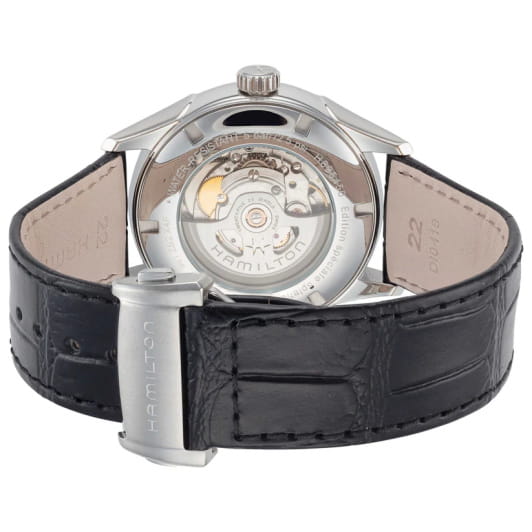 Мужские наручные часы Hamilton Jazzmaster Power Reserve Auto H89545731 элегантные часы, сочетающие классический дизайн и современные технологии. Часы оснащены автоматическим калибром H-13, обеспечивающей запас хода до 80 часов и стабильную точность. Шкала индикатора запаса хода позволяет в полной мере оценить всю мощь автономно функционирующего в течение 80 часов механизма. Корпус диаметром 42 мм выполнен из нержавеющей стали, обеспечивая прочность и долговечность. Стильный циферблат со стрелками с люминесцентным покрытиемЛюминесцентное покрытиеПозволяет считывать показания времени в темноте. Производители наносят на стрелки, часовые индексы, безель или поверхность циферблата светонакопительный состав, дающий холодное свечение.. Поверхность циферблата защищена сапфировым стекломСапфировое стеклоПрочный и надёжный материал из кристалла сапфира синтетического происхождения, характеризующийся особой твёрдостью и устойчивостью к царапинам и повреждениям., устойчивым к царапинам. Изысканный кожаный ремень на раскладной застёжкеРаскладная застёжкаТакой тип застёжки используется только на браслетах из металла. Она никогда не раскрывается полностью, происходит разделение на 2 и более частей. Раскладывающая застёжка снизит вероятность потери часов к минимуму. обеспечивает комфортное ношение и надёжную фиксацию на запястье. Окошко даты находится в положении 3 часа. Класс водозащиты: 50 метров, позволит защитить корпус от случайных брызг или капель дождя.