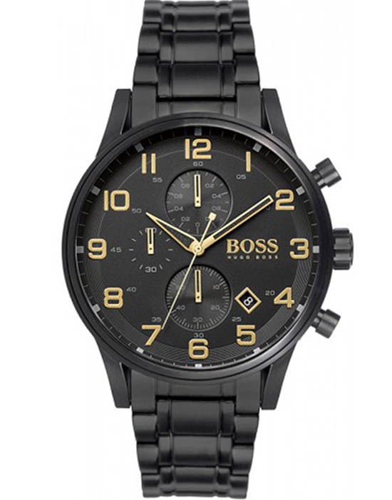 Мужские кварцевые часы Hugo Boss Aeroliner HB1513275 сочетают спортивный стиль с функциональностью в круглом корпусе из нержавеющей стали диаметром 44 мм с чёрным прочным минеральным стекломМинеральное стеклоМинеральное стекло представляет собой искусственно выращенный минерал кварца. Такое стекло отличается особой устойчивостью к повреждениям и царапинам. Уступает по некоторым качествам сапфировому стеклу., устойчивым к царапинам. Модель оснащена кварцевым механизмом с функциями хронографаХронографФункция позволяет измерять отрезки времени с особой точностью: часы, минуты, секунды. Верным признаком хронографа является наличие на циферблате 3 дополнительных окошек-счётчиков. и календарём (индикация даты), а также арабскими метками на чёрном циферблате для оптимальной читаемости. Стальной браслет шириной 22 мм с чёрным покрытием и клипсой обеспечивает комфортную посадку, а (5 атм) защищает от брызгов воды и дождя.