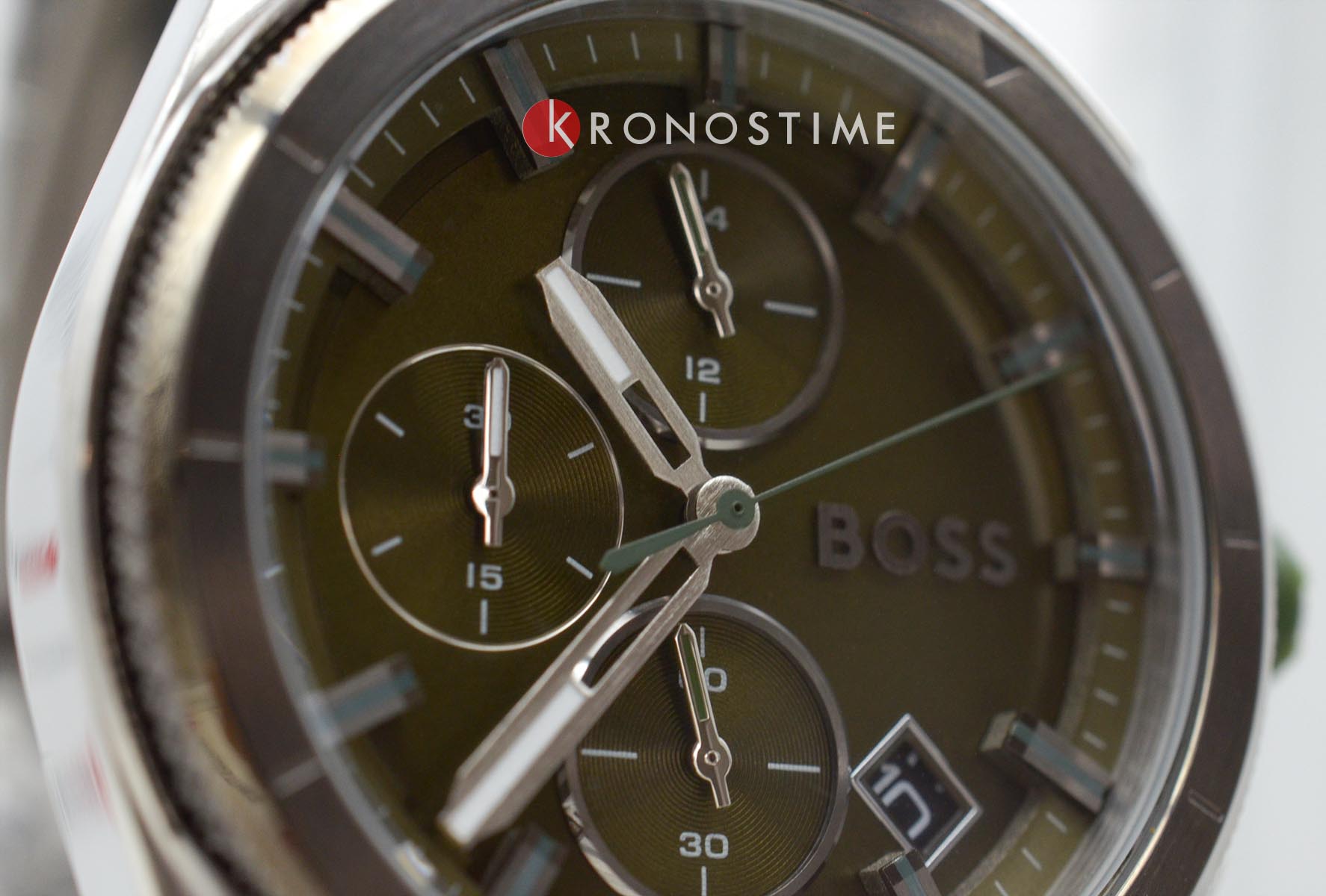 Мужские часы Hugo Boss Volane HB 1513951 представлены в круглом 44-мм корпусе из нержавеющей стали. Оснащены кварцевым механизмом с функциями хронографаХронографФункция позволяет измерять отрезки времени с особой точностью: часы, минуты, секунды. Верным признаком хронографа является наличие на циферблате 3 дополнительных окошек-счётчиков. и секундомеромСекундомерСекундоме́р — прибор, способный измерять интервалы времени с точностью до долей секунды.. Зеленый циферблат защищен устойчивым к царапинам минеральным стекломМинеральное стеклоМинеральное стекло представляет собой искусственно выращенный минерал кварца. Такое стекло отличается особой устойчивостью к повреждениям и царапинам. Уступает по некоторым качествам сапфировому стеклу.. Стальной браслет серебристого цвета дополнен раскладной застёжкойРаскладная застёжкаТакой тип застёжки используется только на браслетах из металла. Она никогда не раскрывается полностью, происходит разделение на 2 и более частей. Раскладывающая застёжка снизит вероятность потери часов к минимуму., а стрелки покрыты люминесцентным составомЛюминесцентное покрытиеПозволяет считывать показания времени в темноте. Производители наносят на стрелки, часовые индексы, безель или поверхность циферблата светонакопительный состав, дающий холодное свечение. для видимости в темноте. Водонепроницаемость 100 метров (10 ATM) позволяет использовать часы для плавания.