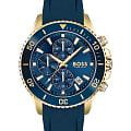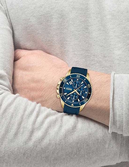 Мужские часы Hugo Boss Admiral HB1513965 представлены в круглом 46-мм корпусе из нержавеющей стали с желтым и синим IP-покрытиемIP-покрытиеМетод ионного напыления. Демонстрирует повышенную устойчивость к истиранию, окислению и химическим веществам. Под воздействием высокого давления и температуры около 1500°C молекулы металла надёжно соединяются с частицами корпуса часов.. Оснащены кварцевым механизмом с функциями хронографаХронографФункция позволяет измерять отрезки времени с особой точностью: часы, минуты, секунды. Верным признаком хронографа является наличие на циферблате 3 дополнительных окошек-счётчиков. и секундомеромСекундомерСекундоме́р — прибор, способный измерять интервалы времени с точностью до долей секунды. на безелеБезельВнешний ободок, закрепляющий стекло. В спортивных часах так называется поворотное кольцо с делениями на циферблате, выполняет роль таймера – замеряет отрезки времени на шкале. Неподвижный безель – элемент декора. Однонаправленно вращающийся безель на дайверских часах позволяет фиксировать моменты погружения и выныривания на поверхность.. Синий циферблат защищен устойчивым к царапинам минеральным стекломМинеральное стеклоМинеральное стекло представляет собой искусственно выращенный минерал кварца. Такое стекло отличается особой устойчивостью к повреждениям и царапинам. Уступает по некоторым качествам сапфировому стеклу.. Силиконовый ремешок дополнен стандартной застежкой, а стрелки покрыты люминесцентным составомЛюминесцентное покрытиеПозволяет считывать показания времени в темноте. Производители наносят на стрелки, часовые индексы, безель или поверхность циферблата светонакопительный состав, дающий холодное свечение. для видимости в темноте. Водонепроницаемость 100 метров (10 ATM) позволяет использовать часы для плавания.