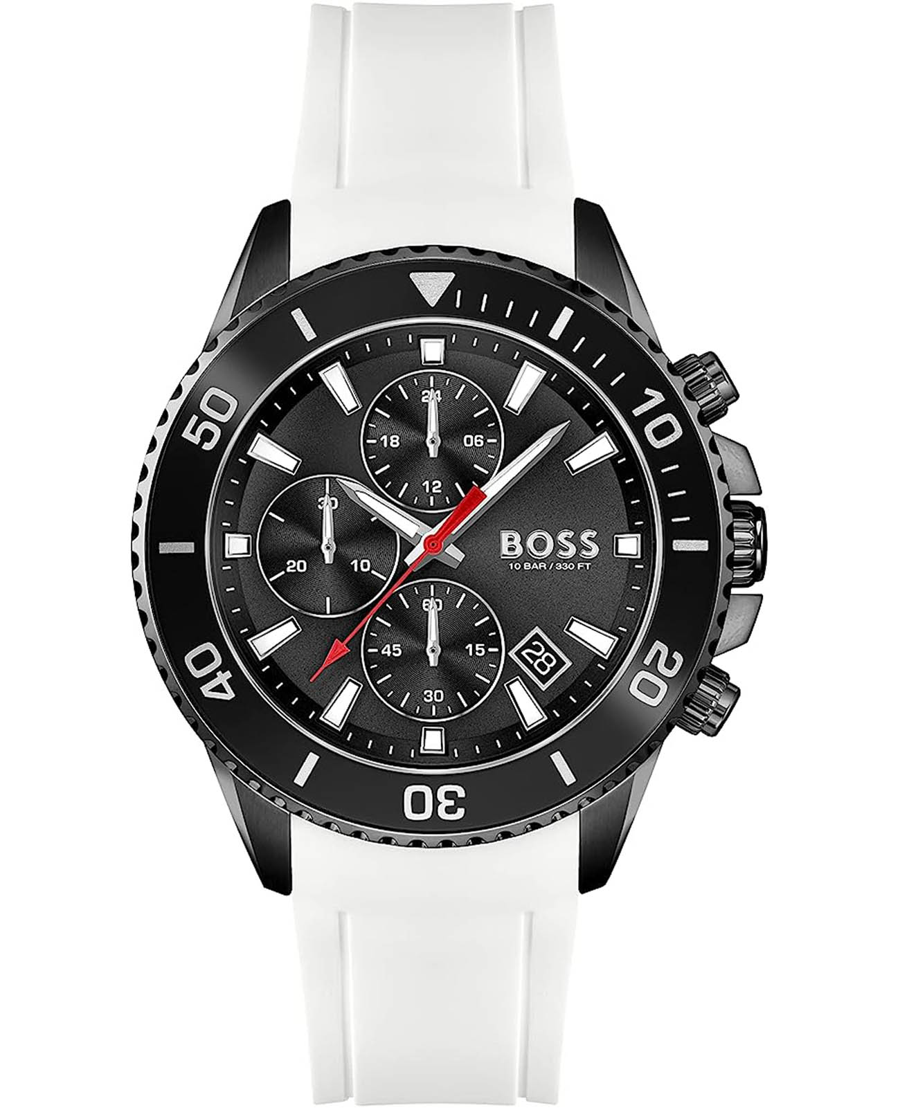 Мужские часы Hugo Boss Admiral HB1513966 представлены в круглом 46-мм корпусе из нержавеющей стали с IP-покрытиемIP-покрытиеМетод ионного напыления. Демонстрирует повышенную устойчивость к истиранию, окислению и химическим веществам. Под воздействием высокого давления и температуры около 1500°C молекулы металла надёжно соединяются с частицами корпуса часов.. Оснащены кварцевым механизмом с функциями хронографаХронографФункция позволяет измерять отрезки времени с особой точностью: часы, минуты, секунды. Верным признаком хронографа является наличие на циферблате 3 дополнительных окошек-счётчиков. и секундомеромСекундомерСекундоме́р — прибор, способный измерять интервалы времени с точностью до долей секунды. на безелеБезельВнешний ободок, закрепляющий стекло. В спортивных часах так называется поворотное кольцо с делениями на циферблате, выполняет роль таймера – замеряет отрезки времени на шкале. Неподвижный безель – элемент декора. Однонаправленно вращающийся безель на дайверских часах позволяет фиксировать моменты погружения и выныривания на поверхность.. Черный циферблат защищен устойчивым к царапинам минеральным стекломМинеральное стеклоМинеральное стекло представляет собой искусственно выращенный минерал кварца. Такое стекло отличается особой устойчивостью к повреждениям и царапинам. Уступает по некоторым качествам сапфировому стеклу.. Силиконовый ремешок белого цвета дополнен стандартной застежкой, а стрелки покрыты люминесцентным составомЛюминесцентное покрытиеПозволяет считывать показания времени в темноте. Производители наносят на стрелки, часовые индексы, безель или поверхность циферблата светонакопительный состав, дающий холодное свечение. для видимости в темноте. Водонепроницаемость 100 метров (10 ATM) позволяет использовать часы для плавания.