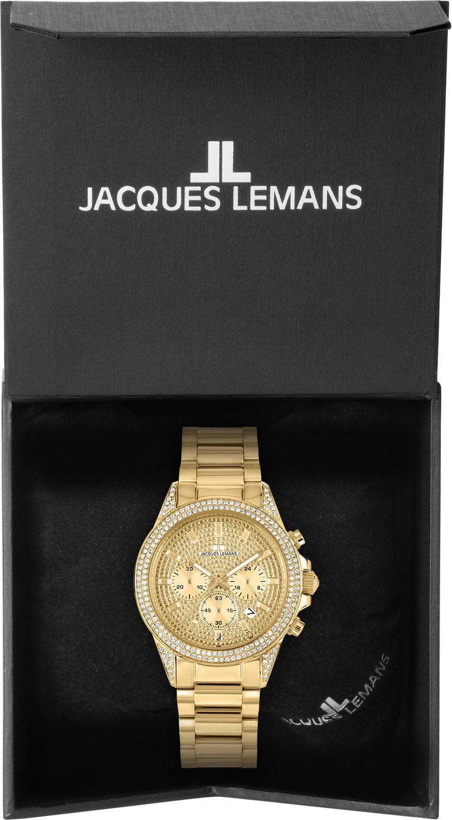 Женские австрийские часы с хронографом Jacques Lemans Design Collection 1-2051C, кварцевый механизм с высокой точностью. Класс водозащиты: 100 метров, позволит плавать, нырять и заниматься другими водными видами спорта. Корпус часов изготовлен из стали, золотистого цвета.