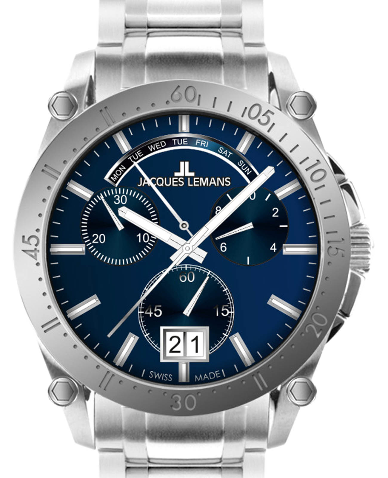 Мужские часы-хронографХронографФункция позволяет измерять отрезки времени с особой точностью: часы, минуты, секунды. Верным признаком хронографа является наличие на циферблате 3 дополнительных окошек-счётчиков. Jacques Lemans 1-2198E – лаконичная красота и изысканная элегантность. Оригинальная модель с классическим оформлением станет превосходным завершением образа, наделив его индивидуальным характером. Корпус выполнен из нержавеющей стали, диаметром 44 мм, что обеспечивает долговечность и утончённый внешний вид. Ударопрочное минеральное стеклоМинеральное стеклоМинеральное стекло представляет собой искусственно выращенный минерал кварца. Такое стекло отличается особой устойчивостью к повреждениям и царапинам. Уступает по некоторым качествам сапфировому стеклу. с сапфировым напылением защищает циферблат от царапин. Стальной браслет на раскладной застёжкеРаскладная застёжкаТакой тип застёжки используется только на браслетах из металла. Она никогда не раскрывается полностью, происходит разделение на 2 и более частей. Раскладывающая застёжка снизит вероятность потери часов к минимуму. обеспечивает комфортное ношение. Водозащита 100 метров позволит плавать, нырять и заниматься другими водными видами спорта. Стрелки и метки с люминесцентным покрытиемЛюминесцентное покрытиеПозволяет считывать показания времени в темноте. Производители наносят на стрелки, часовые индексы, безель или поверхность циферблата светонакопительный состав, дающий холодное свечение. позволяющие легко определять время даже в темноте. Окошко даты находится в положении 6 часов. Широкое окошко дня недели в положении 12 часов позволяет показывать название дня недели. Это аксессуар для мужчины, который ценит классический стиль и функциональность.