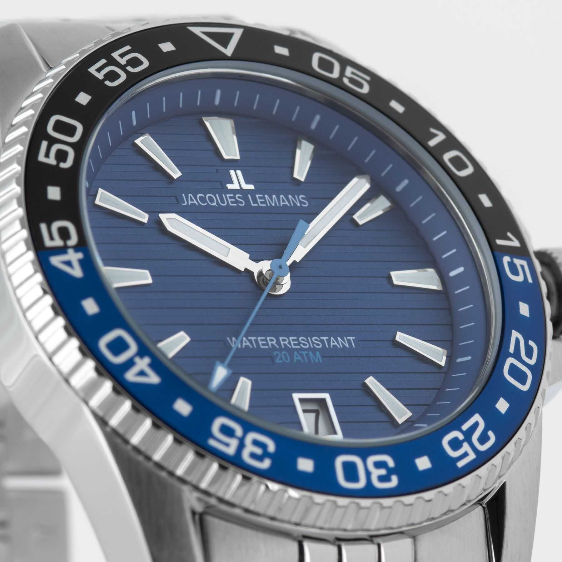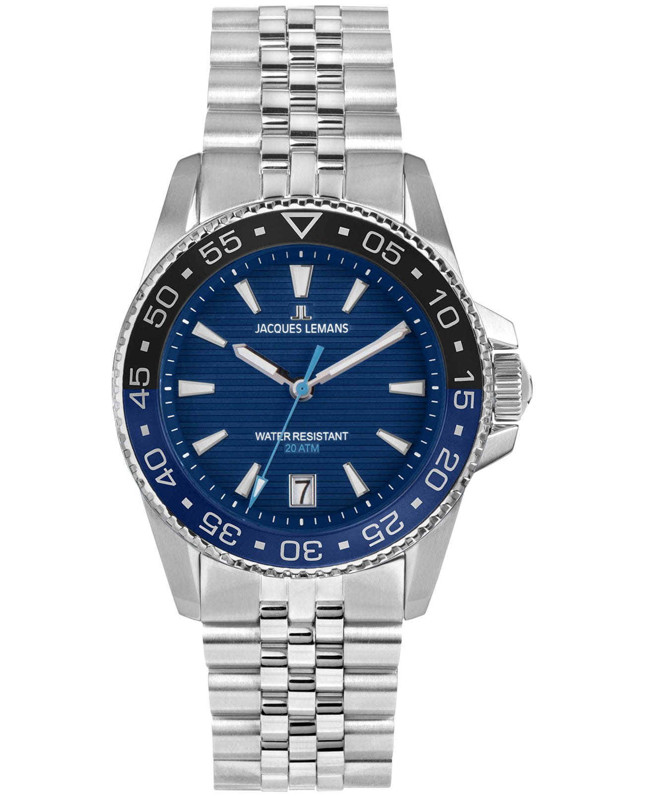 Мужские спортивные часы Jacques Lemans Liverpool Diver 1-2205i представляют собой стильный аксессуар, отражающий идеальное сочетание современного дизайна, надёжности и функциональности. Корпус из нержавеющей стали диаметром 41 мм идеально сбалансирован и элегантен. Ударопрочное минеральное стеклоМинеральное стеклоМинеральное стекло представляет собой искусственно выращенный минерал кварца. Такое стекло отличается особой устойчивостью к повреждениям и царапинам. Уступает по некоторым качествам сапфировому стеклу. Crystex защищает циферблат от царапин. Широкий безельБезельВнешний ободок, закрепляющий стекло. В спортивных часах так называется поворотное кольцо с делениями на циферблате, выполняет роль таймера – замеряет отрезки времени на шкале. Неподвижный безель – элемент декора. Однонаправленно вращающийся безель на дайверских часах позволяет фиксировать моменты погружения и выныривания на поверхность. с PVD-покрытиемPVDУльтратонкое покрытие наносится в технике вакуумного напыления, сочетает в себе нитрид титана особой прочности со слоем золота или оксида хрома. Несёт в себе декоративную или защитную функцию., на который вынесена дополнительная индикация секунд. Стальной браслет на раскладной застёжке с фиксаторомРаскладная застёжкаТакой тип застёжки используется только на браслетах из металла. Она никогда не раскрывается полностью, происходит разделение на 2 и более частей. Раскладывающая застёжка снизит вероятность потери часов к минимуму. обеспечивает комфортное ношение. Водозащита 200 метров позволит плавать, нырять и заниматься другими водными видами спорта. Стрелки и метки с люминесцентным покрытиемЛюминесцентное покрытиеПозволяет считывать показания времени в темноте. Производители наносят на стрелки, часовые индексы, безель или поверхность циферблата светонакопительный состав, дающий холодное свечение. позволяющие легко определять время даже в темноте. Окошко даты находится в положении между 6 часов. Это аксессуар для мужчины, который ценит классический стиль и функциональность.
