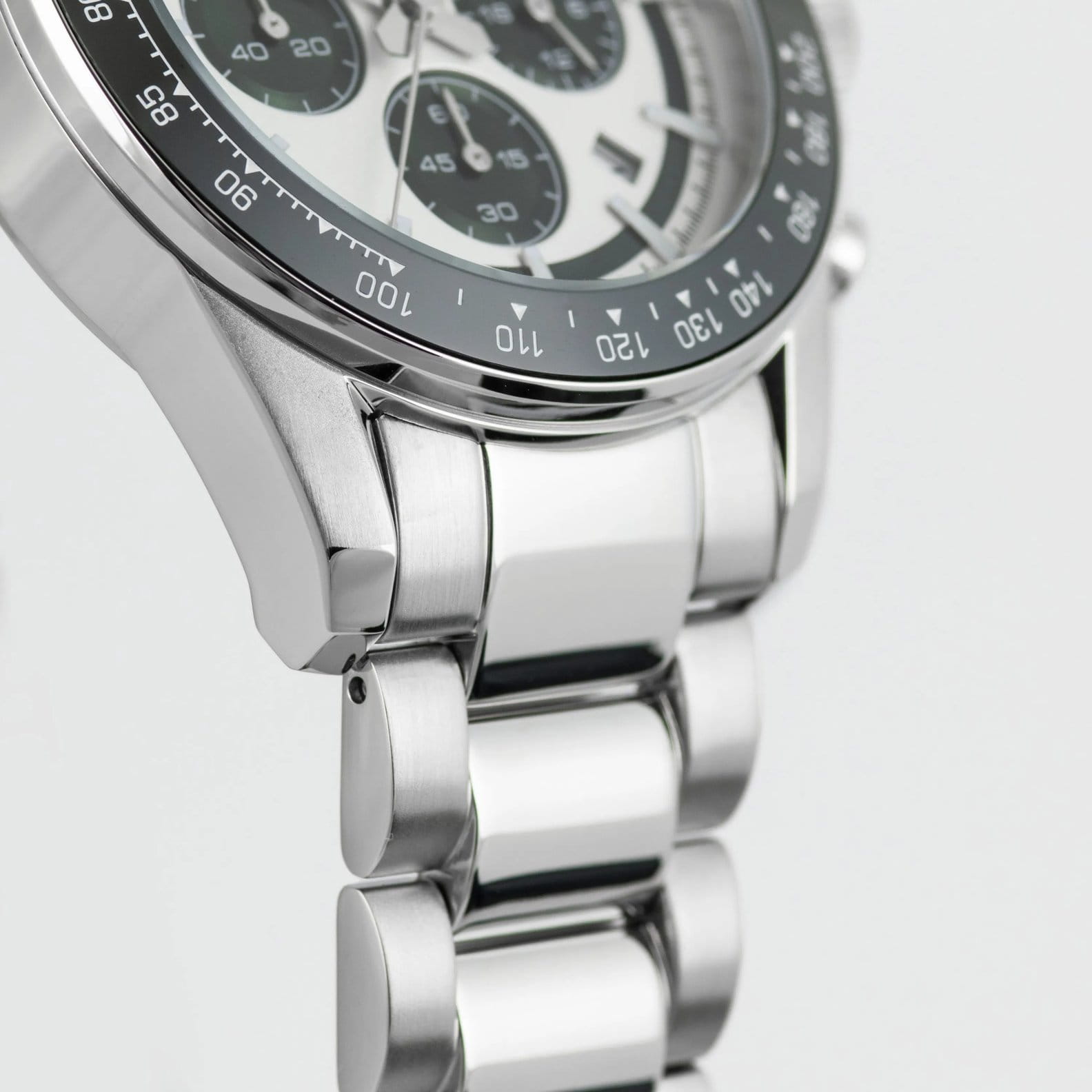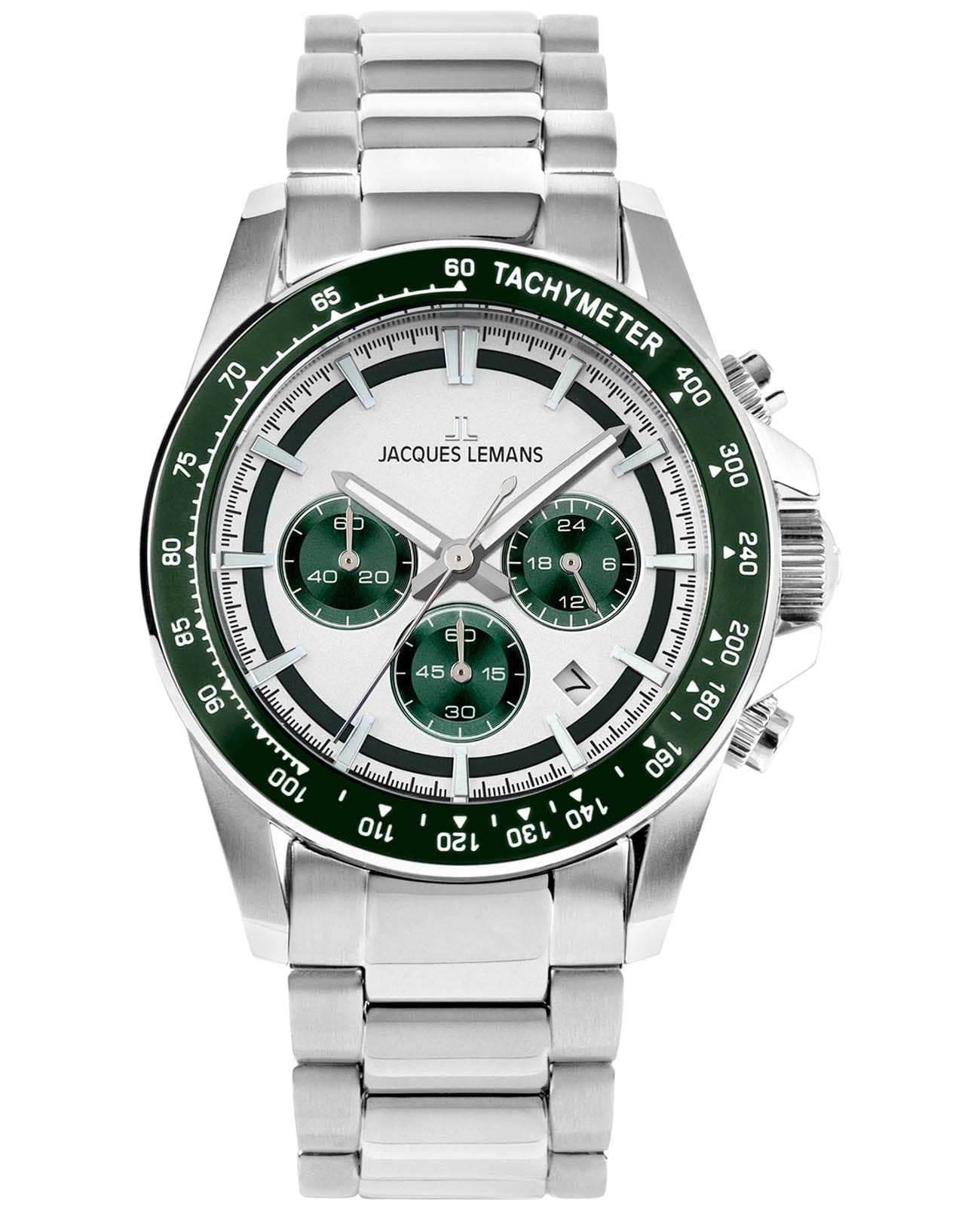 Мужские кварцевые часы-хронографХронографФункция позволяет измерять отрезки времени с особой точностью: часы, минуты, секунды. Верным признаком хронографа является наличие на циферблате 3 дополнительных окошек-счётчиков. с секундомеромСекундомерСекундоме́р — прибор, способный измерять интервалы времени с точностью до долей секунды. Jacques Lemans 1-2207E – лаконичная красота и изысканная элегантность. Оригинальная модель с классическим оформлением станет превосходным завершением образа, наделив его индивидуальным характером. Корпус выполнен из нержавеющей стали серебристого цвета, диаметром 43 мм, что обеспечивает долговечность и утончённый внешний вид. Минеральное стеклоМинеральное стеклоМинеральное стекло представляет собой искусственно выращенный минерал кварца. Такое стекло отличается особой устойчивостью к повреждениям и царапинам. Уступает по некоторым качествам сапфировому стеклу. повышенной прочности Crystex защищает циферблат от царапин. Неподвижный безельБезельВнешний ободок, закрепляющий стекло. В спортивных часах так называется поворотное кольцо с делениями на циферблате, выполняет роль таймера – замеряет отрезки времени на шкале. Неподвижный безель – элемент декора. Однонаправленно вращающийся безель на дайверских часах позволяет фиксировать моменты погружения и выныривания на поверхность. с PVD-покрытиемPVDУльтратонкое покрытие наносится в технике вакуумного напыления, сочетает в себе нитрид титана особой прочности со слоем золота или оксида хрома. Несёт в себе декоративную или защитную функцию. и тахиметромТахиметрРазмеченная шкала, располагается на ободке или безеле часов. Тахиметр позволяет рассчитать скорость на определённом участке пути, расстояние измеряется в километрах или милях.. Стальной браслет на раскладной застёжке с фиксаторомРаскладная застёжкаТакой тип застёжки используется только на браслетах из металла. Она никогда не раскрывается полностью, происходит разделение на 2 и более частей. Раскладывающая застёжка снизит вероятность потери часов к минимуму. обеспечивает комфортное ношение Водозащита 200 метров позволит плавать, нырять и заниматься другими водными видами спорта. Стрелки и метки с люминесцентным покрытиемЛюминесцентное покрытиеПозволяет считывать показания времени в темноте. Производители наносят на стрелки, часовые индексы, безель или поверхность циферблата светонакопительный состав, дающий холодное свечение. позволяющие легко определять время даже в темноте. 12-ти и 24-х часовой формат времени. Окошко даты находится в положении между 4 и 5 часами. Рифленая заводная головка с защитой. Это аксессуар для мужчины, который ценит классический стиль и функциональность.