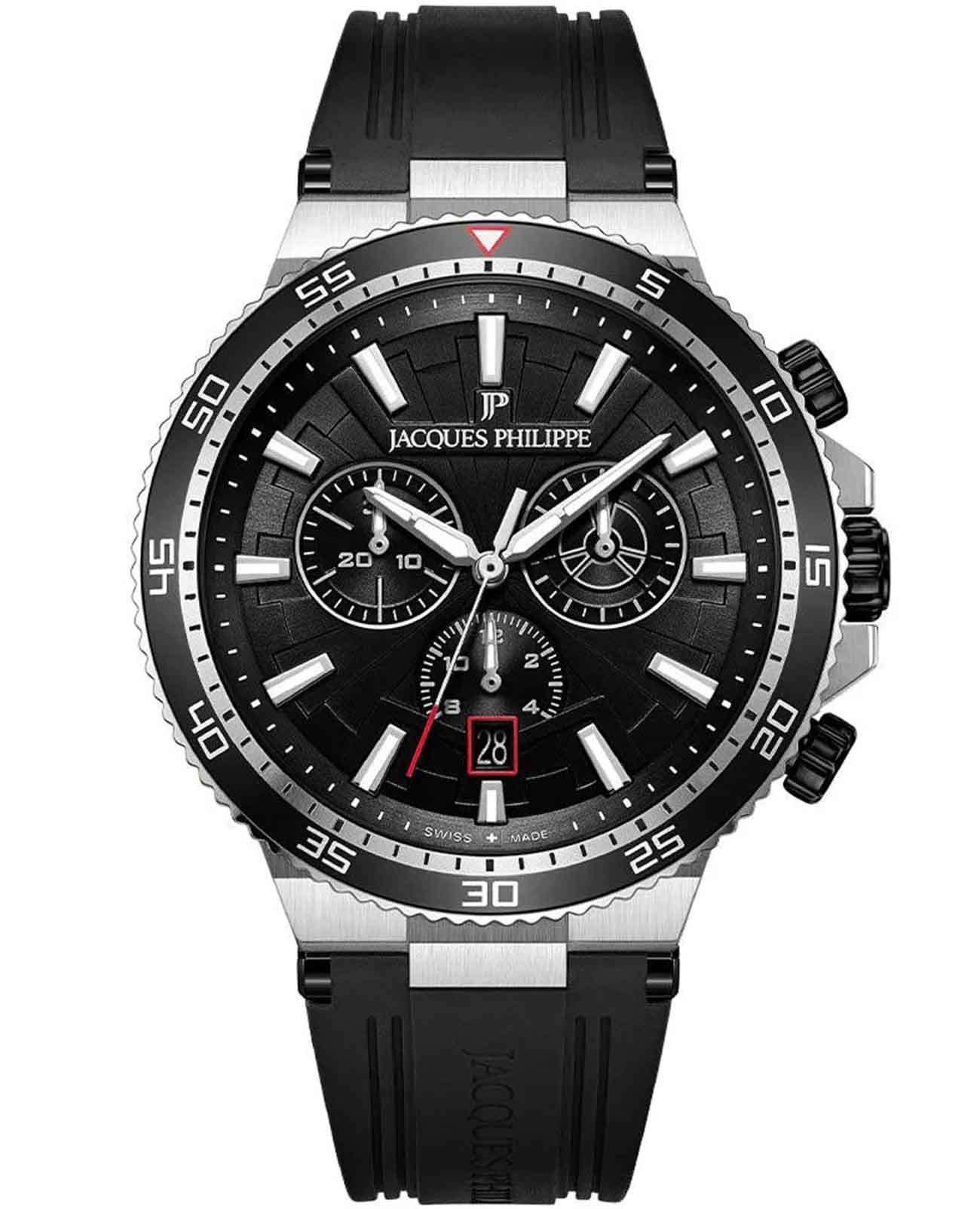 Jacques Philippe JPQGC447411SB — стильные швейцарские часы с функцией хронографаХронографФункция позволяет измерять отрезки времени с особой точностью: часы, минуты, секунды. Верным признаком хронографа является наличие на циферблате 3 дополнительных окошек-счётчиков. и секундомераСекундомерСекундоме́р — прибор, способный измерять интервалы времени с точностью до долей секунды., которые сочетают в себе элегантность и современный функционал. Круглый корпус диаметром 43 мм выполнен из серебристого металла, толщина корпуса составляет 12 мм, а на вращающийся безельБезельВнешний ободок, закрепляющий стекло. В спортивных часах так называется поворотное кольцо с делениями на циферблате, выполняет роль таймера – замеряет отрезки времени на шкале. Неподвижный безель – элемент декора. Однонаправленно вращающийся безель на дайверских часах позволяет фиксировать моменты погружения и выныривания на поверхность. нанесено черное IP-покрытиеIP-покрытиеМетод ионного напыления. Демонстрирует повышенную устойчивость к истиранию, окислению и химическим веществам. Под воздействием высокого давления и температуры около 1500°C молекулы металла надёжно соединяются с частицами корпуса часов., что придает модели выразительный внешний вид и надежную защиту от внешних воздействий. Часы оснащены кварцевым механизмом Ronda 5030.D также обладают функцией отображения даты, что делает их удобными для ежедневного использования. Черный циферблат гармонично сочетается с черным браслетом шириной 23 мм, который фиксируется классической застежкой. Сапфировое стеклоСапфировое стеклоПрочный и надёжный материал из кристалла сапфира синтетического происхождения, характеризующийся особой твёрдостью и устойчивостью к царапинам и повреждениям. защищает часы от царапин, а водозащита 10 АТМ позволяет не снимать их во время плавания и занятий спортом. Стрелки и метки с люминесцентным покрытиемЛюминесцентное покрытиеПозволяет считывать показания времени в темноте. Производители наносят на стрелки, часовые индексы, безель или поверхность циферблата светонакопительный состав, дающий холодное свечение. обеспечивают отличную читаемость в любое время суток.