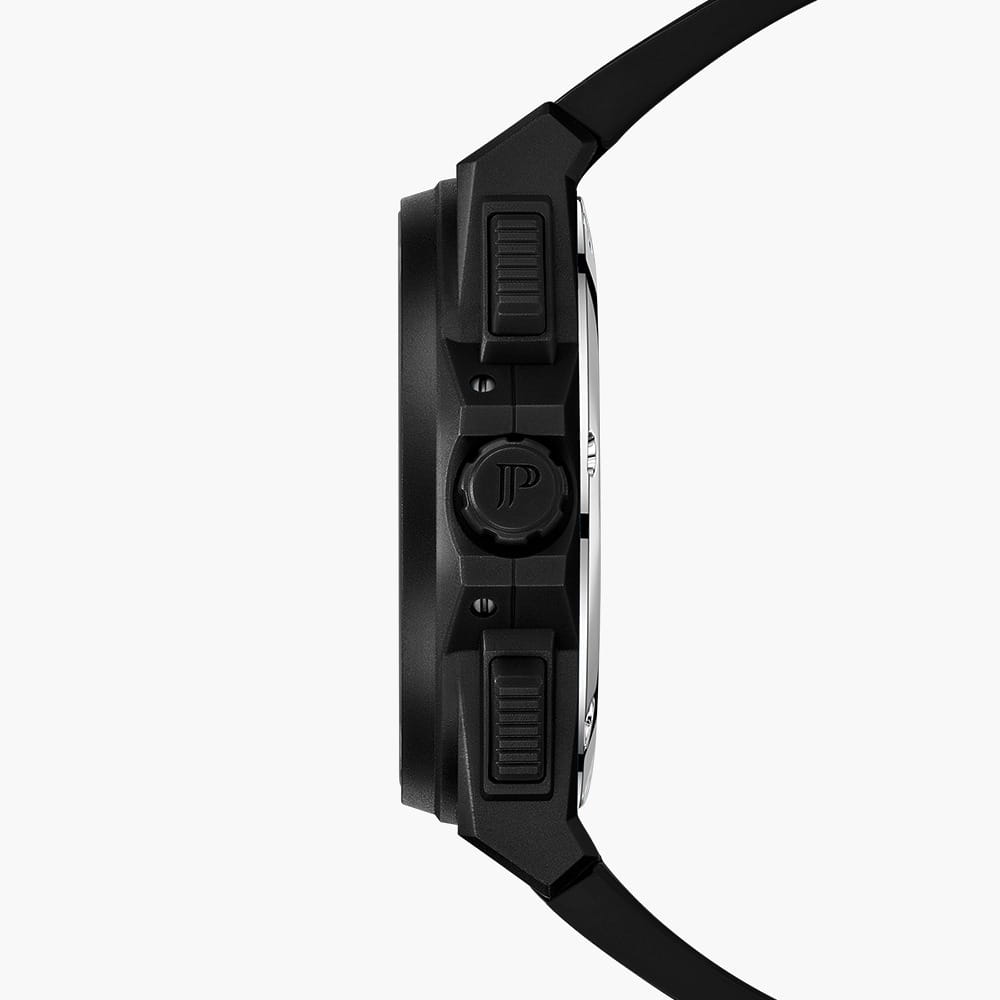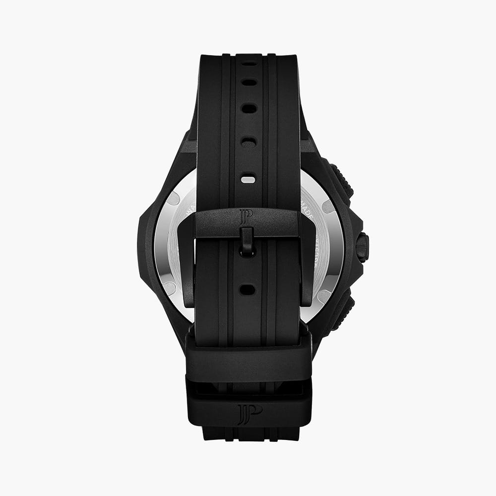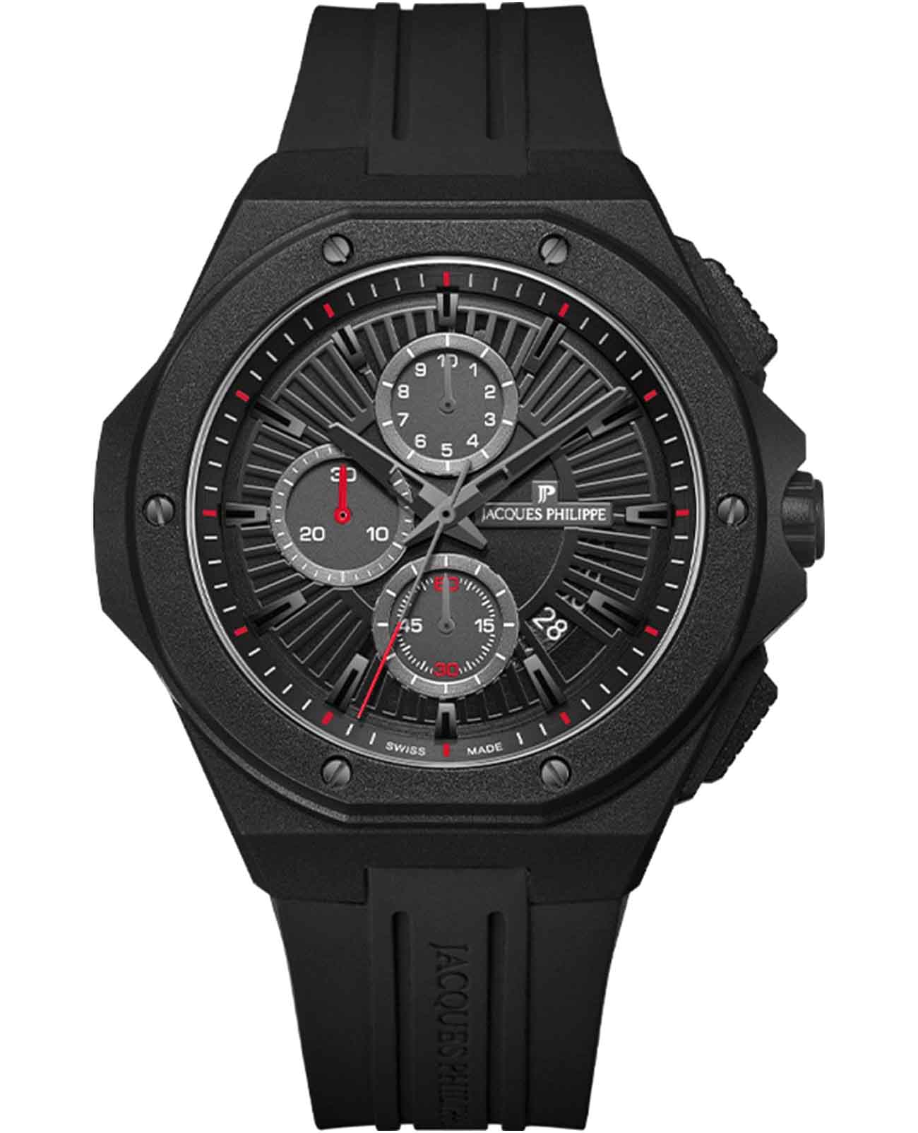 Часы Jacques Philippe JPQGC514411 из коллекции Militia — стильные швейцарские часы с функцией хронографаХронографФункция позволяет измерять отрезки времени с особой точностью: часы, минуты, секунды. Верным признаком хронографа является наличие на циферблате 3 дополнительных окошек-счётчиков. и секундомераСекундомерСекундоме́р — прибор, способный измерять интервалы времени с точностью до долей секунды., которые сочетают в себе элегантность и современный функционал. Модель оснащена надежным кварцевым механизмом, обеспечивающим высокую точность хода. Корпус выполнен из нержавеющей стали 316L с износостойким черным IP-покрытиемIP-покрытиеМетод ионного напыления. Демонстрирует повышенную устойчивость к истиранию, окислению и химическим веществам. Под воздействием высокого давления и температуры около 1500°C молекулы металла надёжно соединяются с частицами корпуса часов., диаметр корпуса составляет 48 мм, толщина — 12,5 мм. Сапфировое стеклоСапфировое стеклоПрочный и надёжный материал из кристалла сапфира синтетического происхождения, характеризующийся особой твёрдостью и устойчивостью к царапинам и повреждениям. защищает часы от царапин и сохраняет прозрачность даже при активном использовании. Черный циферблат дополнен тремя дополнительными индикаторами и окошком даты в положении 4 часа, а стрелки имеют люминесцентное покрытиеЛюминесцентное покрытиеПозволяет считывать показания времени в темноте. Производители наносят на стрелки, часовые индексы, безель или поверхность циферблата светонакопительный состав, дающий холодное свечение.  для удобства чтения времени в темноте. Силиконовый браслет шириной 26 мм и длиной 19 см надежно фиксируется на запястье стандартной застежкой и обеспечивает комфорт при носке. Водозащита 5 АТМ позволяет не снимать часы при мытье рук или прогулках под дождём.