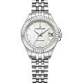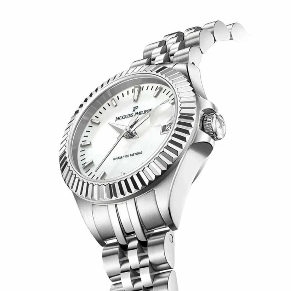 Jacques Philippe JPQLS821326 — женские часы в сдержанном классическом исполнении с акцентом на простоту и надёжность. Корпус диаметром 26 мм выполнен из нержавеющей стали — делает модель универсальной и комфортной в повседневной носке. Циферблат оформлен в светлом металлическом тоне с тонкими стрелками, лаконичными часовыми метками и аккуратным окошком даты в позиции «3 часа». Минималистичный стиль подчёркивает строгость и чистоту дизайна. Поверхность защищена устойчивым к царапинам сапфировым стекломСапфировое стеклоПрочный и надёжный материал из кристалла сапфира синтетического происхождения, характеризующийся особой твёрдостью и устойчивостью к царапинам и повреждениям., которое обеспечивает хорошую читаемость и долговечность. Механизм — точный швейцарский кварц, не требующий подзавода. Он обеспечивает стабильную и бесперебойную работу часов, сохраняя точность в любых условиях. Браслет из нержавеющей стали визуально продолжает корпус и фиксируется на застёжке-бабочке с кнопкамиЗастёжка "бабочка"Такой вид застёжки дополняется предохранителями, помогающими избежать случайного раскрытия браслета. Обладают изящным исполнением. , обеспечивая комфортную посадку. Водозащита до 10 ATM позволяет использовать часы не только в повседневной жизни, но и при активности на воде. Jacques Philippe — это надёжная и универсальная модель для тех, кто ценит швейцарскую точность, простоту и уверенный стиль без лишних деталей.
