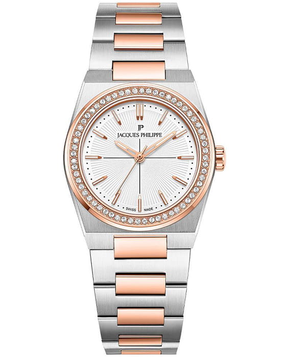 Часы Jacques Philippe JPQLS867328 из коллекции Adastra — элегантные женские часы, сочетающие швейцарское качество и современный дизайн. Корпус диаметром 30 мм выполнен из нержавеющей стали, а циферблат защищён сапфировым стекломСапфировое стеклоПрочный и надёжный материал из кристалла сапфира синтетического происхождения, характеризующийся особой твёрдостью и устойчивостью к царапинам и повреждениям.. БезельБезельВнешний ободок, закрепляющий стекло. В спортивных часах так называется поворотное кольцо с делениями на циферблате, выполняет роль таймера – замеряет отрезки времени на шкале. Неподвижный безель – элемент декора. Однонаправленно вращающийся безель на дайверских часах позволяет фиксировать моменты погружения и выныривания на поверхность. с PVD-покрытиемPVDУльтратонкое покрытие наносится в технике вакуумного напыления, сочетает в себе нитрид титана особой прочности со слоем золота или оксида хрома. Несёт в себе декоративную или защитную функцию. инкрустирован кристаллами.