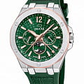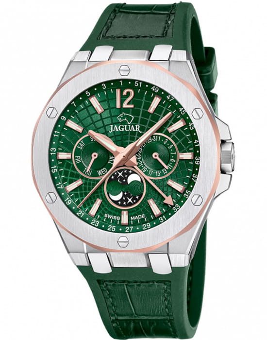 Jaguar J1040/3 из коллекции Moonphase — элегантные мужские часы, сочетающие стиль и функциональность. Корпус диаметром 44 мм выполнен из нержавеющей стали, а безельБезельВнешний ободок, закрепляющий стекло. В спортивных часах так называется поворотное кольцо с делениями на циферблате, выполняет роль таймера – замеряет отрезки времени на шкале. Неподвижный безель – элемент декора. Однонаправленно вращающийся безель на дайверских часах позволяет фиксировать моменты погружения и выныривания на поверхность. покрыт PVD-покрытиемPVDУльтратонкое покрытие наносится в технике вакуумного напыления, сочетает в себе нитрид титана особой прочности со слоем золота или оксида хрома. Несёт в себе декоративную или защитную функцию., что придаёт часам изысканный внешний вид и дополнительную устойчивость к износу. Сапфировое стеклоСапфировое стеклоПрочный и надёжный материал из кристалла сапфира синтетического происхождения, характеризующийся особой твёрдостью и устойчивостью к царапинам и повреждениям. защищает циферблат от царапин и повреждений. Зеленый циферблат с серебристыми индексами и стрелками обеспечивает отличную читаемость. Часы оснащены функциями индикации даты, дня недели и фазы луны, добавляя практичности и элегантности. Ремешок выполнен из кожи, что обеспечивает комфортное ношение. Классическая застёжка гарантирует надёжную фиксацию на запястье. Водозащита до 10 ATM (100 метров) делает часы подходящими для плавания и занятий водными видами спорта. Jaguar J1040/3 — это выбор для мужчин, которые ценят швейцарское качество, стиль и функциональность.