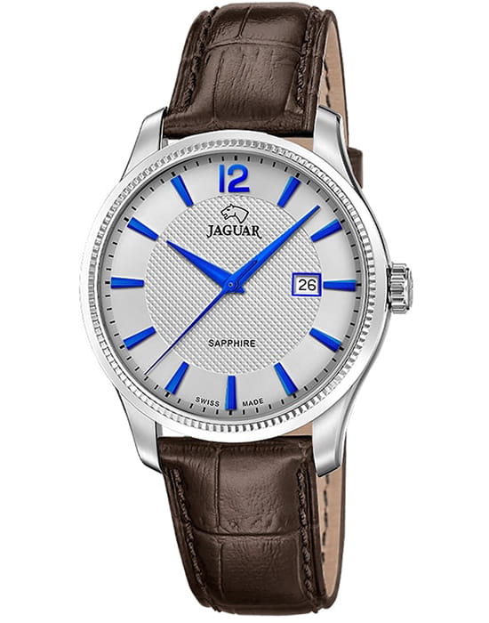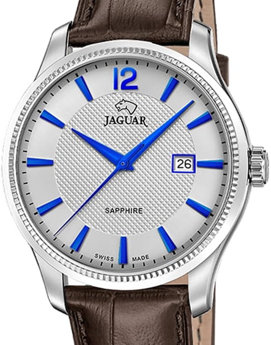 Jaguar J1042/2 из коллекции Acamar — элегантные мужские часы, сочетающие швейцарское качество и современный дизайн. Корпус диаметром 40 мм выполнен из нержавеющей стали, что обеспечивает прочность и долговечность. Сапфировое стеклоСапфировое стеклоПрочный и надёжный материал из кристалла сапфира синтетического происхождения, характеризующийся особой твёрдостью и устойчивостью к царапинам и повреждениям. защищает циферблат от царапин и повреждений. Серебристый циферблат с синими стрелками и индексами подчёркивает изысканный стиль. Часы оснащены функцией индикации даты, расположенной в окошке на отметке «3 часа», что добавляет практичности. Ремешок из коричневой кожи гарантирует комфортное ношение. Классическая застёжка обеспечивает надёжную фиксацию на запястье. Водозащита до 5 ATM (50 метров) делает часы подходящими для повседневного использования. Jaguar J1042/2 — это идеальный выбор для мужчин, которые ценят классический дизайн и современные технологии.