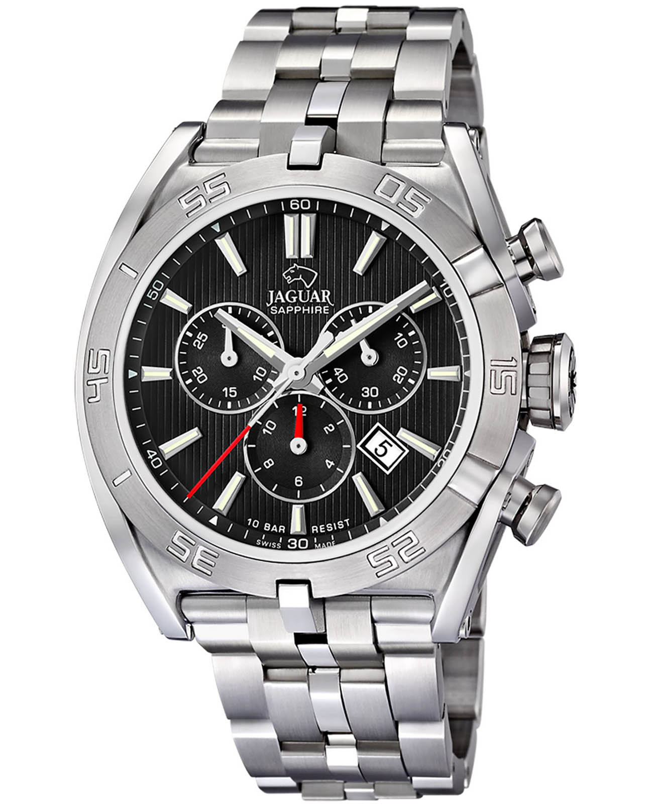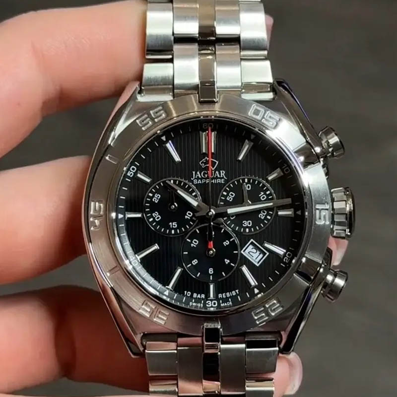 Мужские швейцарские часы-хронографХронографФункция позволяет измерять отрезки времени с особой точностью: часы, минуты, секунды. Верным признаком хронографа является наличие на циферблате 3 дополнительных окошек-счётчиков. Jaguar Executive J852/D. Кварцевый швейцарский калибр Ronda 5030d. Сапфировое стеклоСапфировое стеклоПрочный и надёжный материал из кристалла сапфира синтетического происхождения, характеризующийся особой твёрдостью и устойчивостью к царапинам и повреждениям. устойчивое к мелким механическим повреждениям. Корпус и браслет часов изготовлены из нержавеющей стали. Стрелки и метки с люминесцентным покрытиемЛюминесцентное покрытиеПозволяет считывать показания времени в темноте. Производители наносят на стрелки, часовые индексы, безель или поверхность циферблата светонакопительный состав, дающий холодное свечение.. Окошко даты находится в положении между «4» и «5 часами». Класс водозащиты: 100 метров, позволит плавать, нырять и заниматься другими водными видами спорта. Стальной браслет на раскладной застёжкеРаскладная застёжкаТакой тип застёжки используется только на браслетах из металла. Она никогда не раскрывается полностью, происходит разделение на 2 и более частей. Раскладывающая застёжка снизит вероятность потери часов к минимуму..
