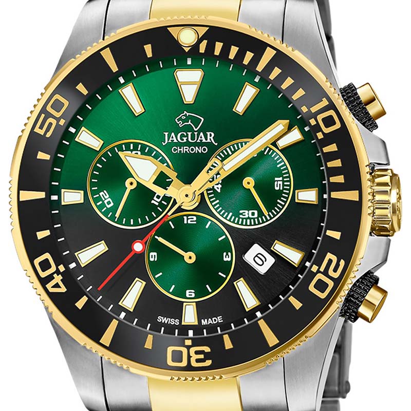 Мужские швейцарские часы-хронографХронографФункция позволяет измерять отрезки времени с особой точностью: часы, минуты, секунды. Верным признаком хронографа является наличие на циферблате 3 дополнительных окошек-счётчиков. Jaguar Executive Diver Chrono J862/5. Кварцевый швейцарский калибр Ronda 6003D. Сапфировое стеклоСапфировое стеклоПрочный и надёжный материал из кристалла сапфира синтетического происхождения, характеризующийся особой твёрдостью и устойчивостью к царапинам и повреждениям. устойчивое к мелким механическим повреждениям. Корпус часов изготовлен из нержавеющей стали. Стрелки и метки с люминесцентным покрытиемЛюминесцентное покрытиеПозволяет считывать показания времени в темноте. Производители наносят на стрелки, часовые индексы, безель или поверхность циферблата светонакопительный состав, дающий холодное свечение.. Окошко даты находится в положении между «4» и «5 часами». Класс водозащиты: 200 метров, позволит плавать, нырять и заниматься другими водными видами спорта. Стальной браслет с частичным PVD-покрытиемPVDУльтратонкое покрытие наносится в технике вакуумного напыления, сочетает в себе нитрид титана особой прочности со слоем золота или оксида хрома. Несёт в себе декоративную или защитную функцию. на раскладной застёжкеРаскладная застёжкаТакой тип застёжки используется только на браслетах из металла. Она никогда не раскрывается полностью, происходит разделение на 2 и более частей. Раскладывающая застёжка снизит вероятность потери часов к минимуму.. БезельБезельВнешний ободок, закрепляющий стекло. В спортивных часах так называется поворотное кольцо с делениями на циферблате, выполняет роль таймера – замеряет отрезки времени на шкале. Неподвижный безель – элемент декора. Однонаправленно вращающийся безель на дайверских часах позволяет фиксировать моменты погружения и выныривания на поверхность. с PVD-покрытиемPVDУльтратонкое покрытие наносится в технике вакуумного напыления, сочетает в себе нитрид титана особой прочности со слоем золота или оксида хрома. Несёт в себе декоративную или защитную функцию..