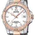 Женские швейцарские часы Jaguar Couple Diver J871/1. Кварцевый швейцарский калибр Ronda 705. Сапфировое стеклоСапфировое стеклоПрочный и надёжный материал из кристалла сапфира синтетического происхождения, характеризующийся особой твёрдостью и устойчивостью к царапинам и повреждениям. устойчивое к мелким механическим повреждениям. Корпус часов изготовлен из нержавеющей стали. Стрелки и метки с люминесцентным покрытиемЛюминесцентное покрытиеПозволяет считывать показания времени в темноте. Производители наносят на стрелки, часовые индексы, безель или поверхность циферблата светонакопительный состав, дающий холодное свечение.. Окошко даты находится в положении 3 часа. Класс водозащиты: 200 метров, позволит плавать, нырять и заниматься другими водными видами спорта. Стальной браслет с частичным PVD-покрытиемPVDУльтратонкое покрытие наносится в технике вакуумного напыления, сочетает в себе нитрид титана особой прочности со слоем золота или оксида хрома. Несёт в себе декоративную или защитную функцию. на раскладной застёжкеРаскладная застёжкаТакой тип застёжки используется только на браслетах из металла. Она никогда не раскрывается полностью, происходит разделение на 2 и более частей. Раскладывающая застёжка снизит вероятность потери часов к минимуму.. Циферблат украшен кристаллом. БезельБезельВнешний ободок, закрепляющий стекло. В спортивных часах так называется поворотное кольцо с делениями на циферблате, выполняет роль таймера – замеряет отрезки времени на шкале. Неподвижный безель – элемент декора. Однонаправленно вращающийся безель на дайверских часах позволяет фиксировать моменты погружения и выныривания на поверхность. с PVD-покрытиемPVDУльтратонкое покрытие наносится в технике вакуумного напыления, сочетает в себе нитрид титана особой прочности со слоем золота или оксида хрома. Несёт в себе декоративную или защитную функцию..