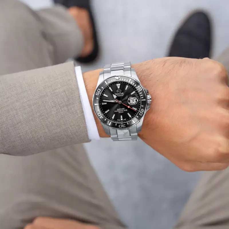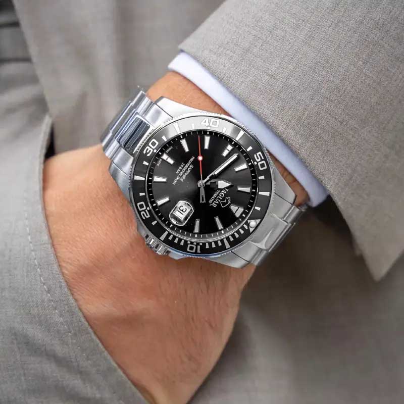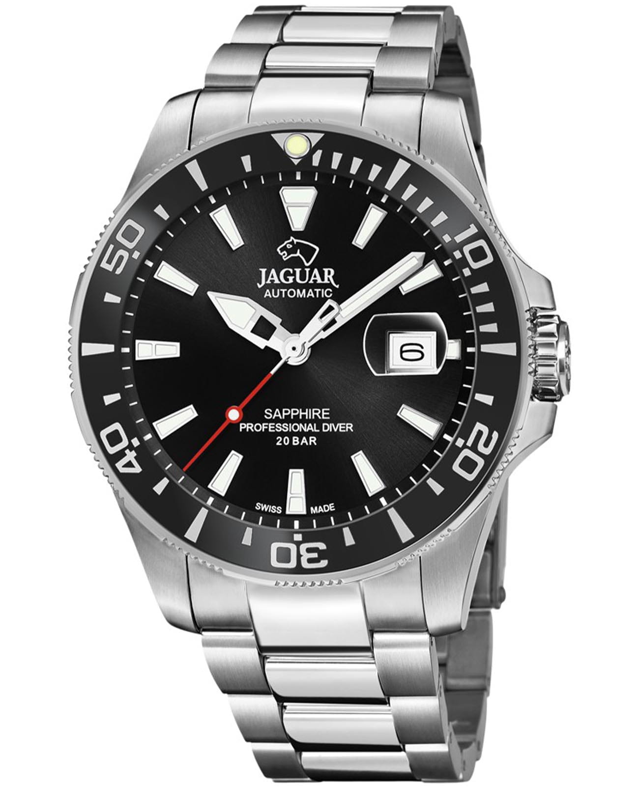 Мужские швейцарские часы Jaguar Automatic Diver J886/3. Автоматический швейцарский калибр ETA 2824-2. Сапфировое стеклоСапфировое стеклоПрочный и надёжный материал из кристалла сапфира синтетического происхождения, характеризующийся особой твёрдостью и устойчивостью к царапинам и повреждениям. устойчивое к мелким механическим повреждениям. Корпус и браслет часов изготовлены из нержавеющей стали. Стрелки и метки с люминесцентным покрытиемЛюминесцентное покрытиеПозволяет считывать показания времени в темноте. Производители наносят на стрелки, часовые индексы, безель или поверхность циферблата светонакопительный состав, дающий холодное свечение.. Окошко даты находится в положении 3 часа. Класс водозащиты: 200 метров, позволит плавать, нырять и заниматься другими водными видами спорта. Стальной браслет на раскладной застёжкеРаскладная застёжкаТакой тип застёжки используется только на браслетах из металла. Она никогда не раскрывается полностью, происходит разделение на 2 и более частей. Раскладывающая застёжка снизит вероятность потери часов к минимуму.. БезельБезельВнешний ободок, закрепляющий стекло. В спортивных часах так называется поворотное кольцо с делениями на циферблате, выполняет роль таймера – замеряет отрезки времени на шкале. Неподвижный безель – элемент декора. Однонаправленно вращающийся безель на дайверских часах позволяет фиксировать моменты погружения и выныривания на поверхность. с PVD-покрытиемPVDУльтратонкое покрытие наносится в технике вакуумного напыления, сочетает в себе нитрид титана особой прочности со слоем золота или оксида хрома. Несёт в себе декоративную или защитную функцию..