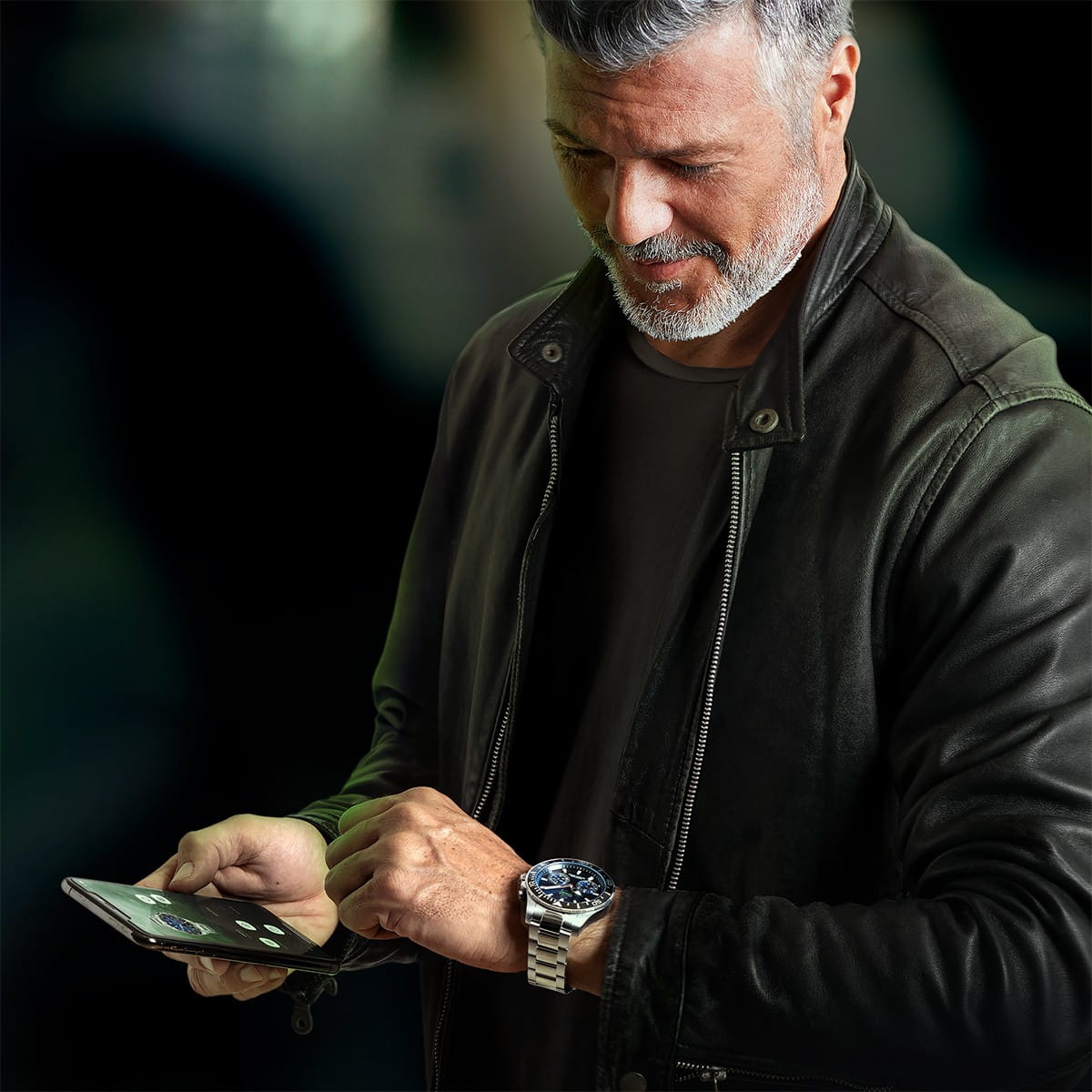 Мужские швейцарские часы Jaguar Connected J888/6. Сапфировое стеклоСапфировое стеклоПрочный и надёжный материал из кристалла сапфира синтетического происхождения, характеризующийся особой твёрдостью и устойчивостью к царапинам и повреждениям. устойчивое к мелким механическим повреждениям. Корпус и браслет часов изготовлены из нержавеющей стали. Стрелки и метки с люминесцентным покрытиемЛюминесцентное покрытиеПозволяет считывать показания времени в темноте. Производители наносят на стрелки, часовые индексы, безель или поверхность циферблата светонакопительный состав, дающий холодное свечение.. Календарь находится в положении 8 часов. Класс водозащиты: 200 метров, позволит плавать, нырять и заниматься другими водными видами спорта. Стальной браслет на раскладной застёжкеРаскладная застёжкаТакой тип застёжки используется только на браслетах из металла. Она никогда не раскрывается полностью, происходит разделение на 2 и более частей. Раскладывающая застёжка снизит вероятность потери часов к минимуму.. БезельБезельВнешний ободок, закрепляющий стекло. В спортивных часах так называется поворотное кольцо с делениями на циферблате, выполняет роль таймера – замеряет отрезки времени на шкале. Неподвижный безель – элемент декора. Однонаправленно вращающийся безель на дайверских часах позволяет фиксировать моменты погружения и выныривания на поверхность. с PVD-покрытиемPVDУльтратонкое покрытие наносится в технике вакуумного напыления, сочетает в себе нитрид титана особой прочности со слоем золота или оксида хрома. Несёт в себе декоративную или защитную функцию.. За точный ход работы часов, из коллекции Connected, отвечает кварцевый гибридный механизм швейцарского производства со Смарт-Модулем. Данный тип механизма обеспечивает возможность подключить часы к телефону через Bluetooth и управлять большим рядом дополнительных функций на выбор с помошью приложения Jaguar. Дополнительные функции: отображение даты и дня недели, секундомер, таймер, GMT, шагомер, поиск телефона, включение/выключение звука телефона при входящих вызовах, переключение музыки, вибро-уведомления.