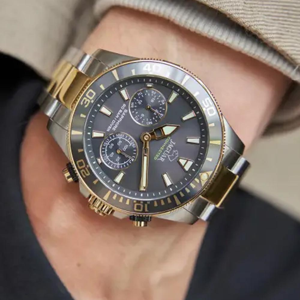 Мужские швейцарские часы Jaguar Connected J889/4. Сапфировое стеклоСапфировое стеклоПрочный и надёжный материал из кристалла сапфира синтетического происхождения, характеризующийся особой твёрдостью и устойчивостью к царапинам и повреждениям. устойчивое к мелким механическим повреждениям. Корпус часов изготовлен из нержавеющей стали. Стрелки и метки с люминесцентным покрытиемЛюминесцентное покрытиеПозволяет считывать показания времени в темноте. Производители наносят на стрелки, часовые индексы, безель или поверхность циферблата светонакопительный состав, дающий холодное свечение.. Календарь находится в положении 8 часов. Класс водозащиты: 200 метров, позволит плавать, нырять и заниматься другими водными видами спорта. Стальной браслет с частичным PVD-покрытиемPVDУльтратонкое покрытие наносится в технике вакуумного напыления, сочетает в себе нитрид титана особой прочности со слоем золота или оксида хрома. Несёт в себе декоративную или защитную функцию. на раскладной застёжкеРаскладная застёжкаТакой тип застёжки используется только на браслетах из металла. Она никогда не раскрывается полностью, происходит разделение на 2 и более частей. Раскладывающая застёжка снизит вероятность потери часов к минимуму.. БезельБезельВнешний ободок, закрепляющий стекло. В спортивных часах так называется поворотное кольцо с делениями на циферблате, выполняет роль таймера – замеряет отрезки времени на шкале. Неподвижный безель – элемент декора. Однонаправленно вращающийся безель на дайверских часах позволяет фиксировать моменты погружения и выныривания на поверхность. с PVD-покрытиемPVDУльтратонкое покрытие наносится в технике вакуумного напыления, сочетает в себе нитрид титана особой прочности со слоем золота или оксида хрома. Несёт в себе декоративную или защитную функцию.. За точный ход работы часов, из коллекции Connected, отвечает кварцевый гибридный механизм швейцарского производства со Смарт-Модулем. Данный тип механизма обеспечивает возможность подключить часы к телефону через Bluetooth и управлять большим рядом дополнительных функций на выбор с помошью приложения Jaguar. Дополнительные функции: отображение даты и дня недели, секундомер, таймер, GMT, шагомер, поиск телефона, включение/выключение звука телефона при входящих вызовах, переключение музыки, вибро-уведомления.