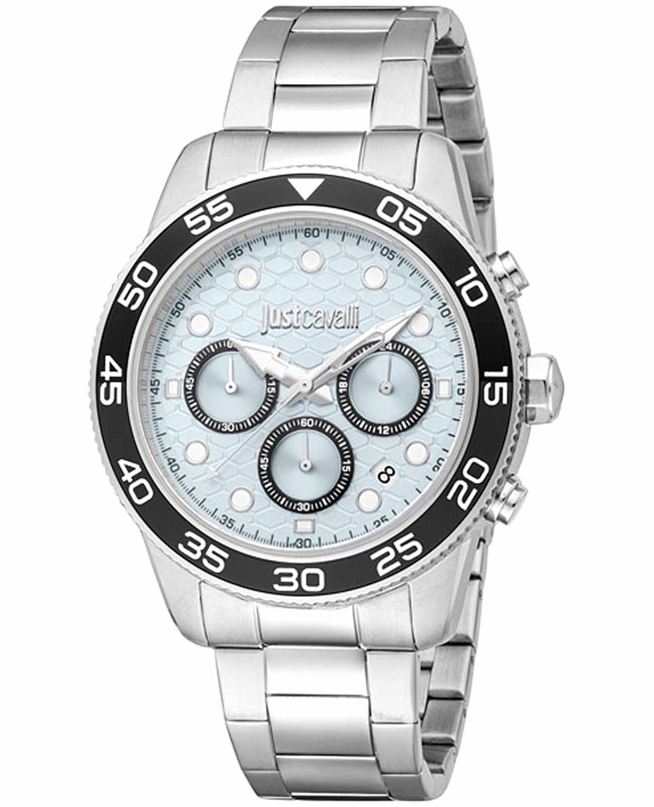 JUST CAVALLI JC1G243M0245 — стильные итальянские часы с функцией хронографаХронографФункция позволяет измерять отрезки времени с особой точностью: часы, минуты, секунды. Верным признаком хронографа является наличие на циферблате 3 дополнительных окошек-счётчиков. и секундомераСекундомерСекундоме́р — прибор, способный измерять интервалы времени с точностью до долей секунды., которые сочетают в себе элегантность и современный функционал. Круглый корпус диаметром 42 мм выполнен из нержавеющей стали, толщина корпуса составляет 11 мм, а на безельБезельВнешний ободок, закрепляющий стекло. В спортивных часах так называется поворотное кольцо с делениями на циферблате, выполняет роль таймера – замеряет отрезки времени на шкале. Неподвижный безель – элемент декора. Однонаправленно вращающийся безель на дайверских часах позволяет фиксировать моменты погружения и выныривания на поверхность. нанесено черное PVD-покрытиеPVDУльтратонкое покрытие наносится в технике вакуумного напыления, сочетает в себе нитрид титана особой прочности со слоем золота или оксида хрома. Несёт в себе декоративную или защитную функцию., что придает модели выразительный внешний вид и надежную защиту от внешних воздействий. Часы оснащены кварцевым механизмом, также обладают функцией отображения даты, что делает их удобными для ежедневного использования. Минеральное стеклоМинеральное стеклоМинеральное стекло представляет собой искусственно выращенный минерал кварца. Такое стекло отличается особой устойчивостью к повреждениям и царапинам. Уступает по некоторым качествам сапфировому стеклу. защищает часы от царапин, а водозащита 100 метров позволяет не снимать их во время плавания и занятий спортом. Стальной браслет на раскладной застёжкеРаскладная застёжкаТакой тип застёжки используется только на браслетах из металла. Она никогда не раскрывается полностью, происходит разделение на 2 и более частей. Раскладывающая застёжка снизит вероятность потери часов к минимуму. обеспечивает комфортное ношение. Стрелки и метки с люминесцентным покрытиемЛюминесцентное покрытиеПозволяет считывать показания времени в темноте. Производители наносят на стрелки, часовые индексы, безель или поверхность циферблата светонакопительный состав, дающий холодное свечение. обеспечивают отличную читаемость в любое время суток.
