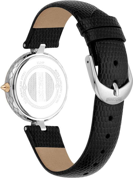JUST CAVALLI JC1L147L0035 — эти элегантные женские часы станут ярким акцентом в вашем образе. Циферблат, украшенный фирменным логотипом Just Cavalli, лаконичен и элегантен. Корпус диаметром 30 мм выполнен из нержавеющей стали, что придает модели выразительный внешний вид и надежную защиту от внешних воздействий. БезельБезельВнешний ободок, закрепляющий стекло. В спортивных часах так называется поворотное кольцо с делениями на циферблате, выполняет роль таймера – замеряет отрезки времени на шкале. Неподвижный безель – элемент декора. Однонаправленно вращающийся безель на дайверских часах позволяет фиксировать моменты погружения и выныривания на поверхность. с PVD-покрытиемPVDУльтратонкое покрытие наносится в технике вакуумного напыления, сочетает в себе нитрид титана особой прочности со слоем золота или оксида хрома. Несёт в себе декоративную или защитную функцию.. Корпус и циферблат украшены кристаллами Swarovski. Часы оснащены кварцевым механизмом. Минеральное стеклоМинеральное стеклоМинеральное стекло представляет собой искусственно выращенный минерал кварца. Такое стекло отличается особой устойчивостью к повреждениям и царапинам. Уступает по некоторым качествам сапфировому стеклу. защищает часы от царапин, а водозащита 50 метров позволяет позволяет не беспокоиться о случайных брызгах. Заводная головка конусообразной формы. Кожаный ремешок на стандартной застёжке. Корпус по бокам украшен гравировкой. Ушки крепления корпуса выполнены в виде головы змеи.